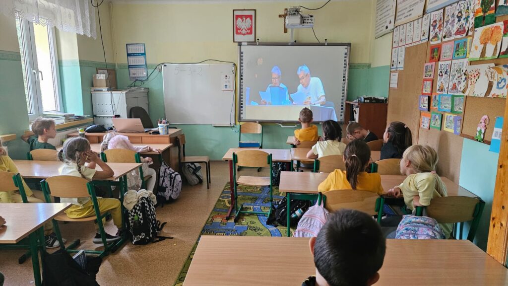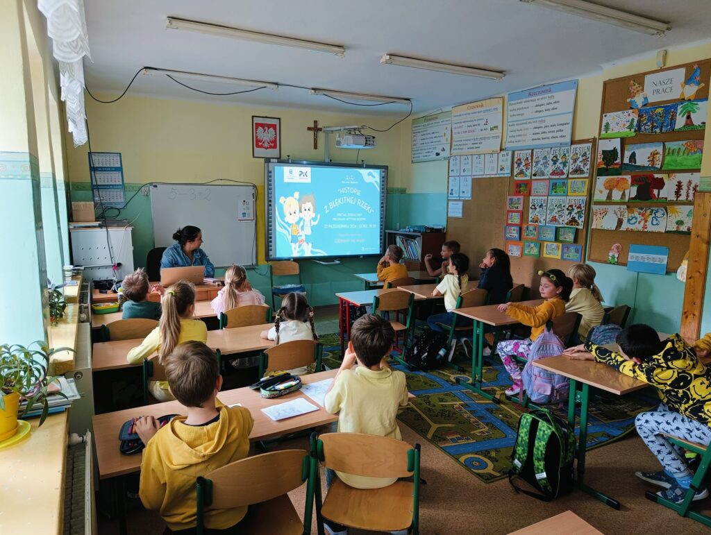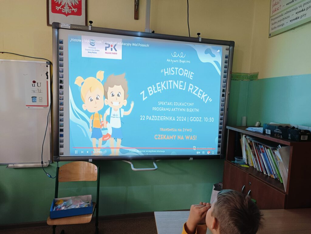 Uczniowie klas I, II, III i IV przyłączyli się do ogólnopolskiego programu edukacyjnego “Aktywni Błękitni – szkołą przyjazna wodzie”. Jego głównym celem jest organizacja działań zmierzających do nabycia umiejętności racjonalnego gospodarowania zasobami wody i bezpiecznego z niej korzystania. Pierwszym działaniem było uczestnictwo w spektaklu edukacyjnym pt. “Historie z błękitnej rzeki” emitowanym na żywo.