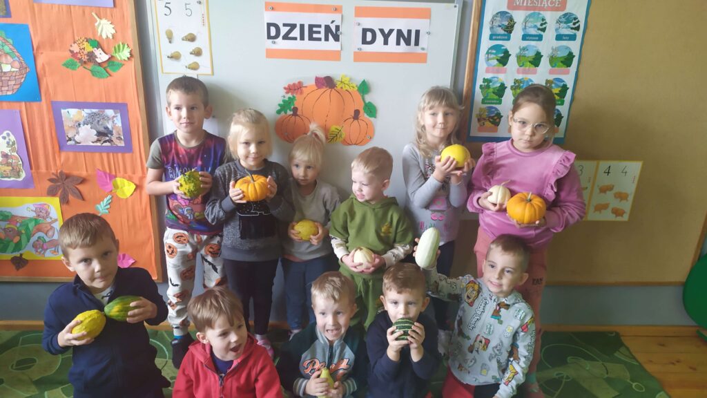 28 października w grupie przedszkolaków w Poddubówku odbył się Dzień Dyni. Dzieci uczestniczyły w zajęciach, podczas których poznały bardzo zdrowe i urodziwe warzywo, którego owocem jest dynia. Mogły je oglądać, dotykać, podziwiać różnorodne ubarwienie. Przedszkolaki wzięły też udział w licznych zabawach z udziałem dyni: slalom dyniowy, dyniowe zawody, skoki przez dynię. Na koniec dzieci malowały dynie farbami. Ten dzień był pełen wrażeń i radości.