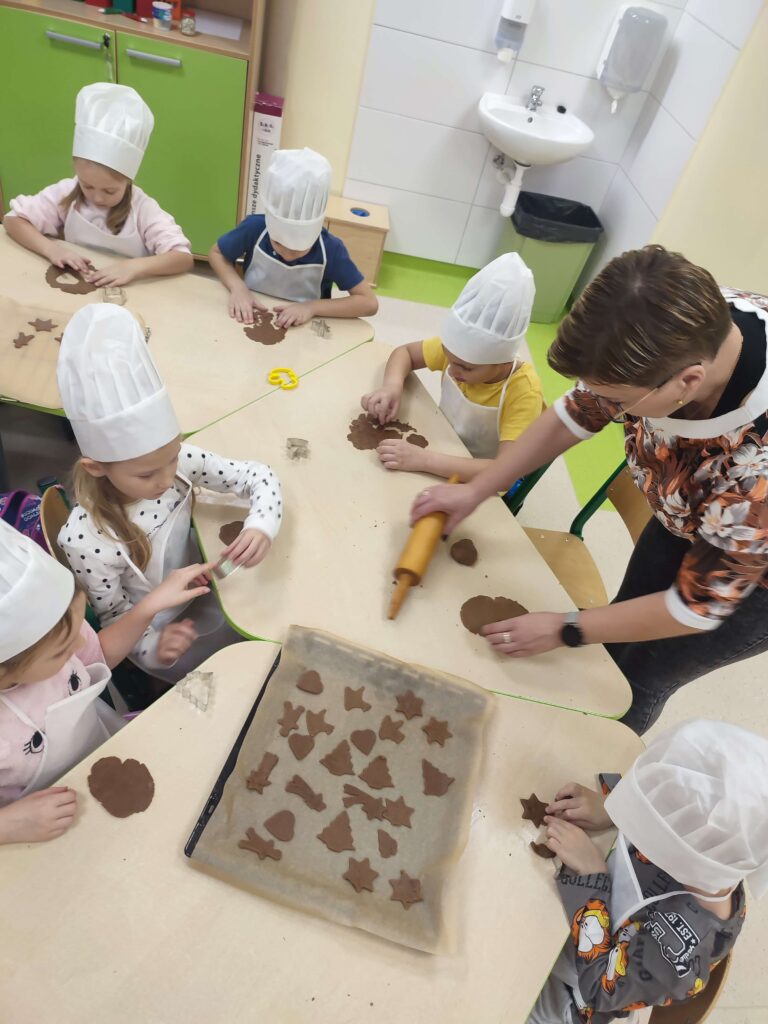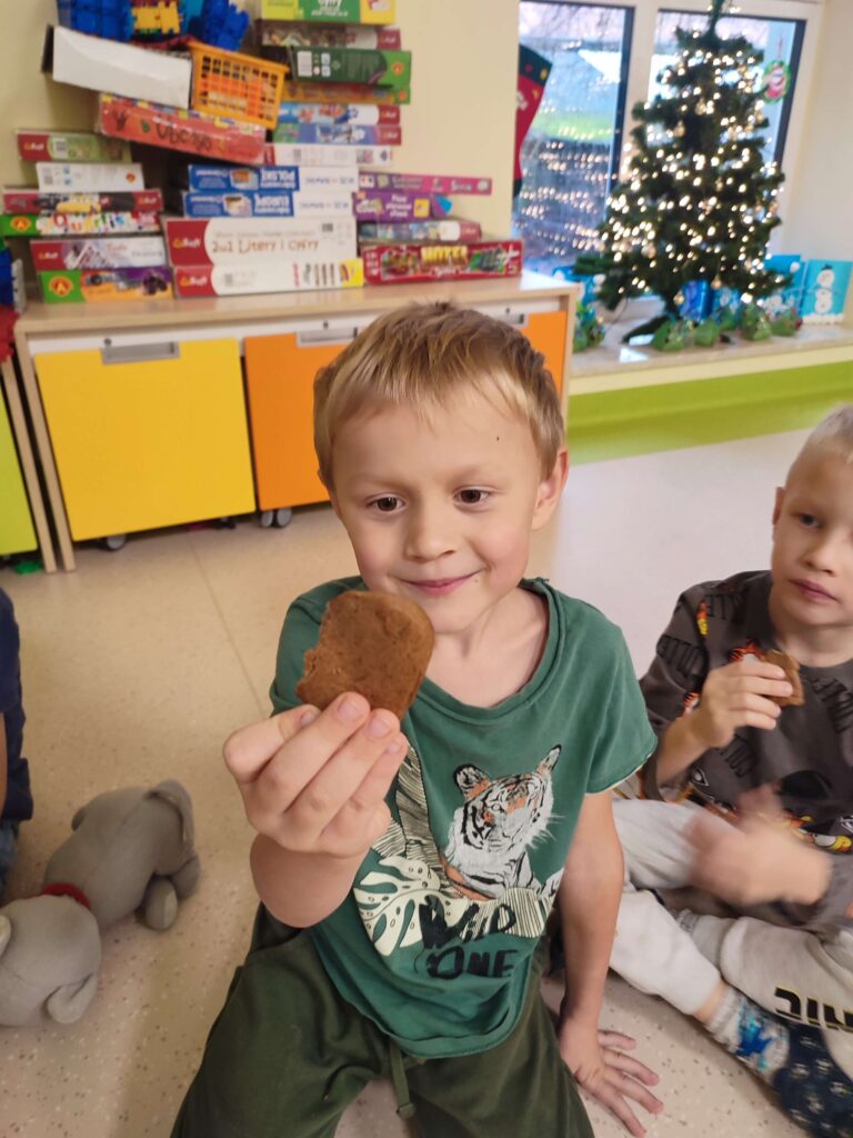 Przypominaliśmy sobie tradycje świąteczne, zdobiliśmy witraże , przygotowywaliśmy kartki świąteczne, ubieraliśmy choinkę  oraz to co pociechy lubią najbardziej piekliśmy pierniczki własnoręcznie wykonane przez naszych przedszkolaków.