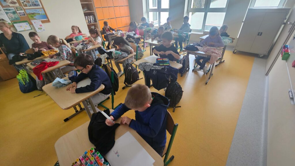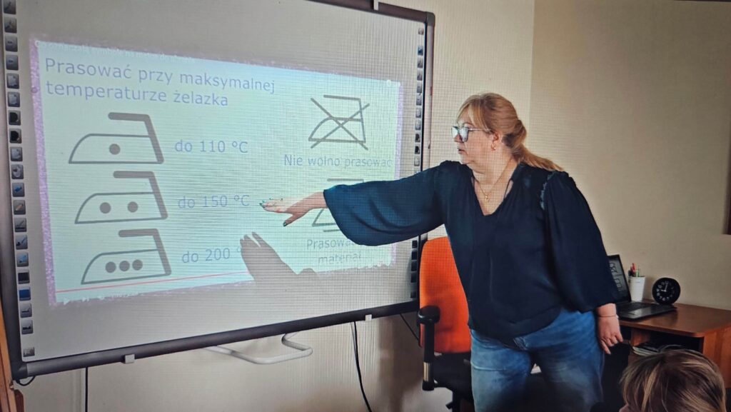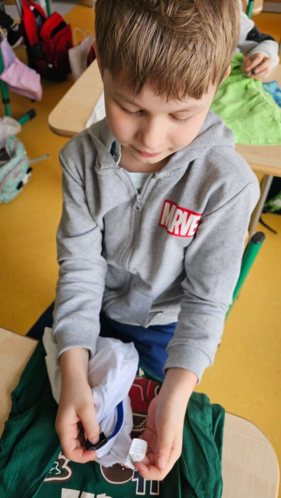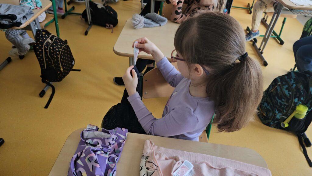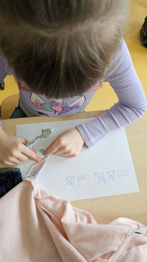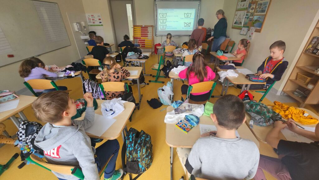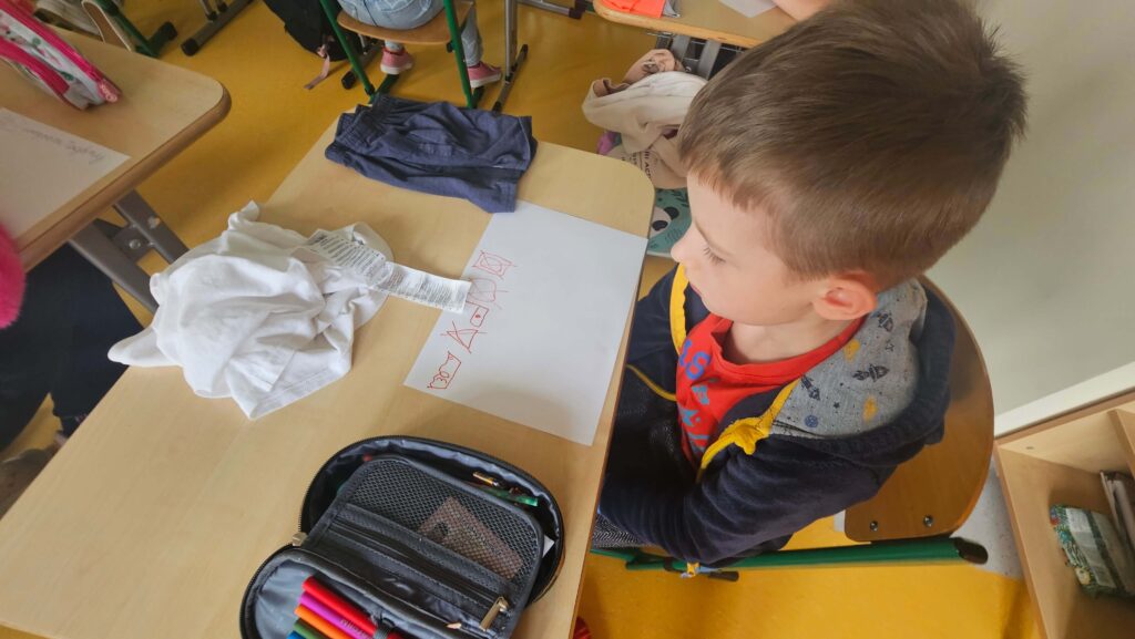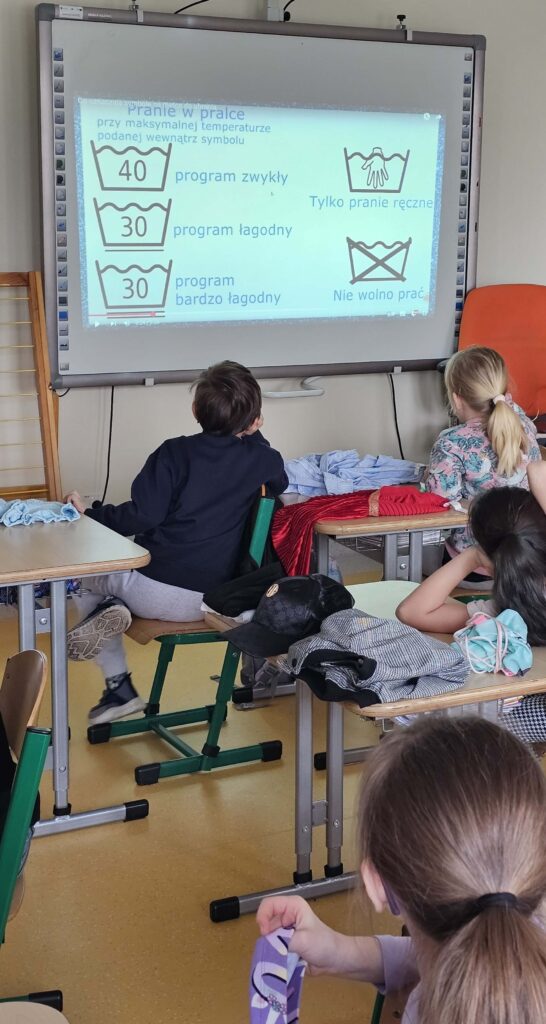 W klasie I zapanował kolorowy zawrót głowy od ilości i rodzajów przyniesionych ubrań. Pierwsze zajęcia w ramach innowacji pt. „Metki i piktogramy czytamy – wszystkie tajniki poznamy”. Rozpoczęliśmy od dyskusji dotyczącej zamieszczania metek na ubraniach, a przedstawiona prezentacja, wyjaśniła znaczenie nieznanych znaczków. Uczniowie samodzielnie dokonali analizy i opisu jak należy postępować podczas prania, prasowania i suszenia. To dopiero początek przygody pozwalającej przybliżyć odczytywanie znaczków, piktogramów i symboli.