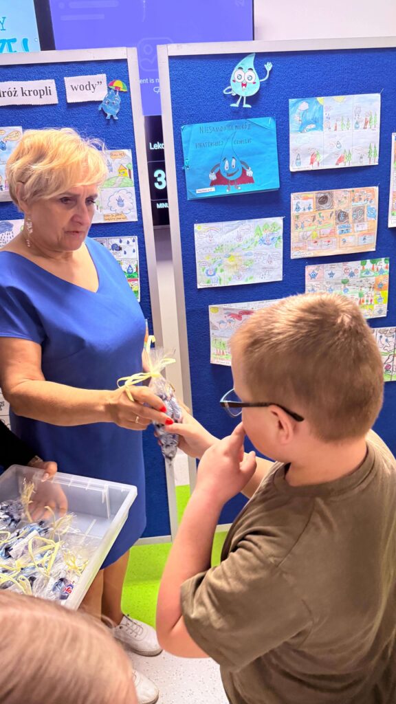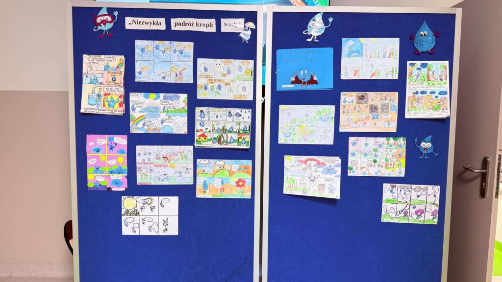 Uczniowie klas I–IV podjęli wyzwanie i zaprojektowali wspaniałe komiksy pt. „Niezwykła podróż kropli wody”. Podczas pracy wykazali się ogromną kreatywnością i pomysłowością – każda historia jest inna i wyjątkowa. Wszystkie prace zostały zgłoszone do Ogólnopolskiego Konkursu „Aktywni Błękitni – szkoła przyjazna wodzie”. Z niecierpliwością czekamy na wyniki, jednak już teraz postanowiliśmy wyróżnić wszystkich uczestników za ich zaangażowanie i troskę o zasoby wodne. Nasi uczniowie doskonale wiedzą, że woda to prawdziwy skarb.