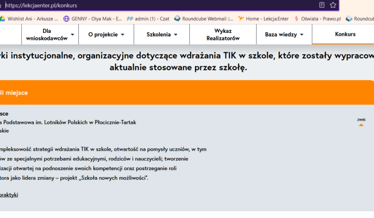 !!!W II edycji Konkursu „Szkoła nowych możliwości. Konkurs dobrych praktyk wykorzystania technologii w nauczaniu” w kategorii “Praktyki instytucjonalne, organizacyjne dotyczące wdrażania TIK w szkole, które zostały wypracowane i są aktualnie stosowane przez szkołę” zajęliśmy I miejsce![]()