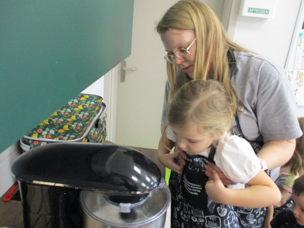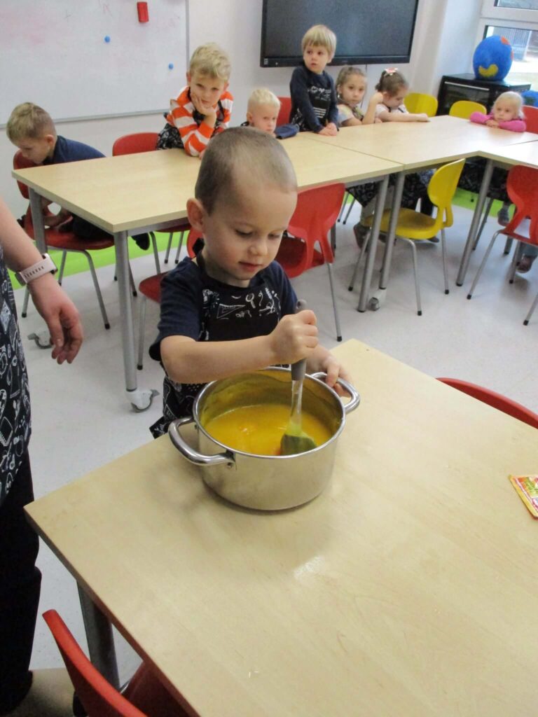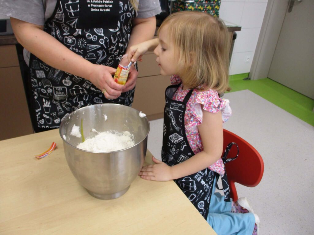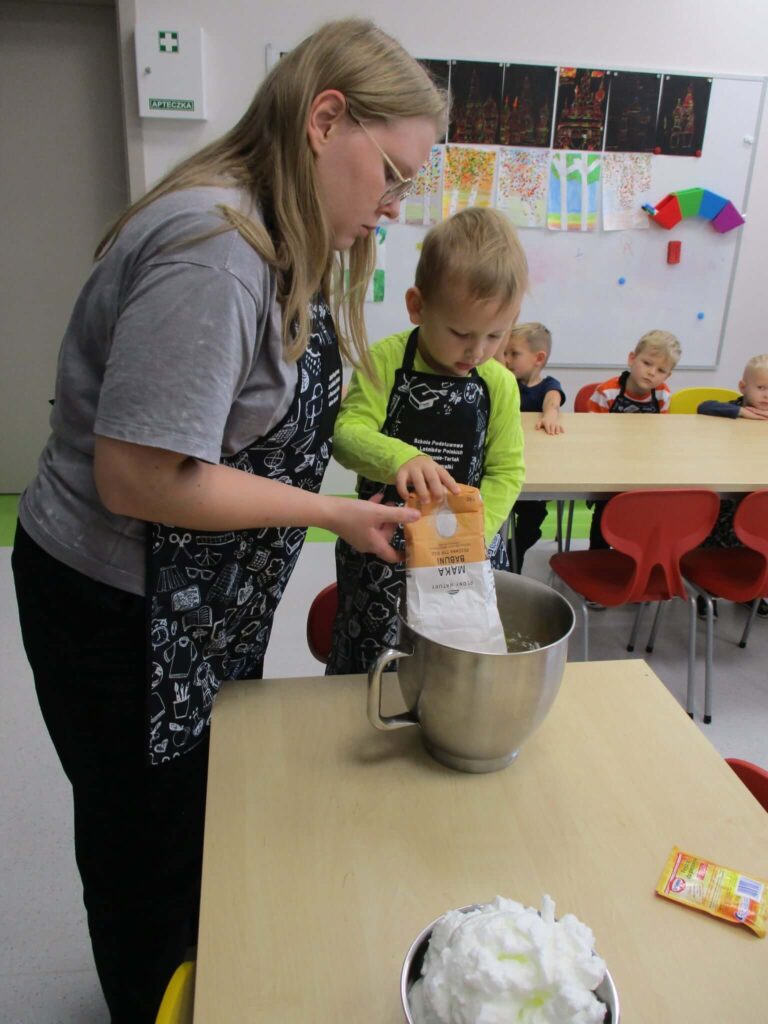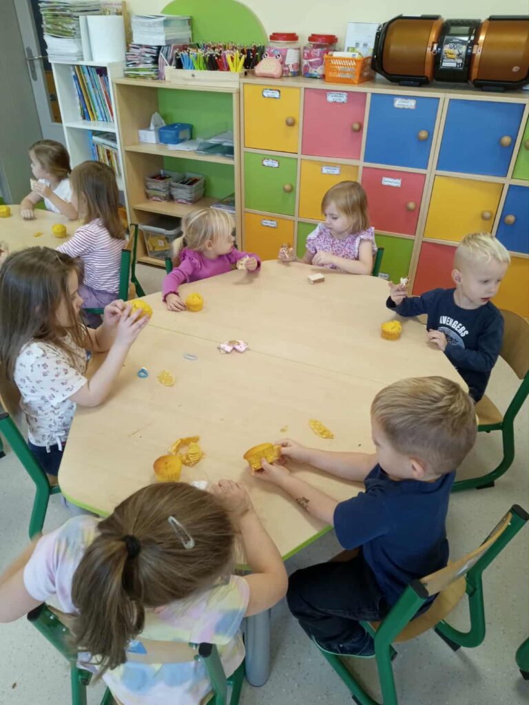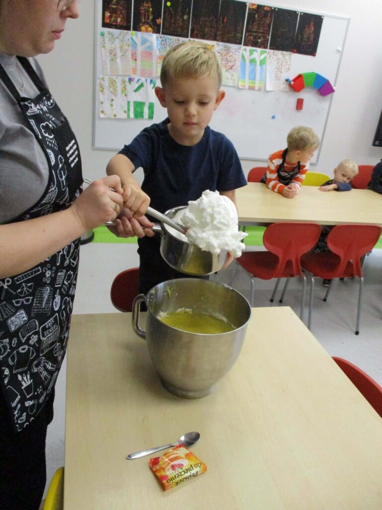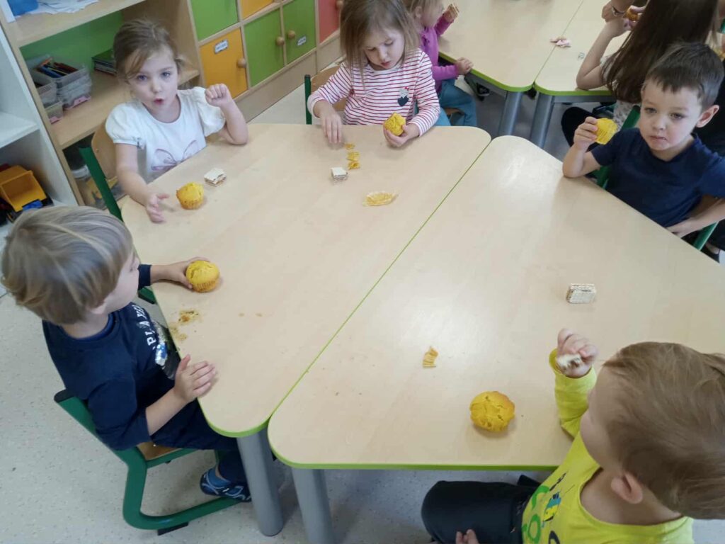 Ależ to był pachnący i radosny dzień! Nasze przedszkolaki zamieniły się w prawdziwych małych cukierników i z zapałem zabrały się za pieczenie dyniowych babeczek. Najpierw wspólnie odmierzały składniki, ucząc się, że w kuchni liczy się precyzja. Najwięcej śmiechu było, gdy poznawaliśmy cukierniczy zwyczaj sprawdzania ubitej piany z białek – oczywiście nad głową! Na szczęście żadna piana nie spadła, a wszystkie dzieci z dumą mogły powiedzieć, że piana była „idealna!”. Po chwili w całym przedszkolu unosił się cudowny zapach pieczonych babeczek, który przyciągał nawet najbardziej głodnych ciekawskich. Na koniec wszyscy z radością zajadali swoje pachnące, złociste wypieki. To był pyszny i pełen uśmiechu dzień!