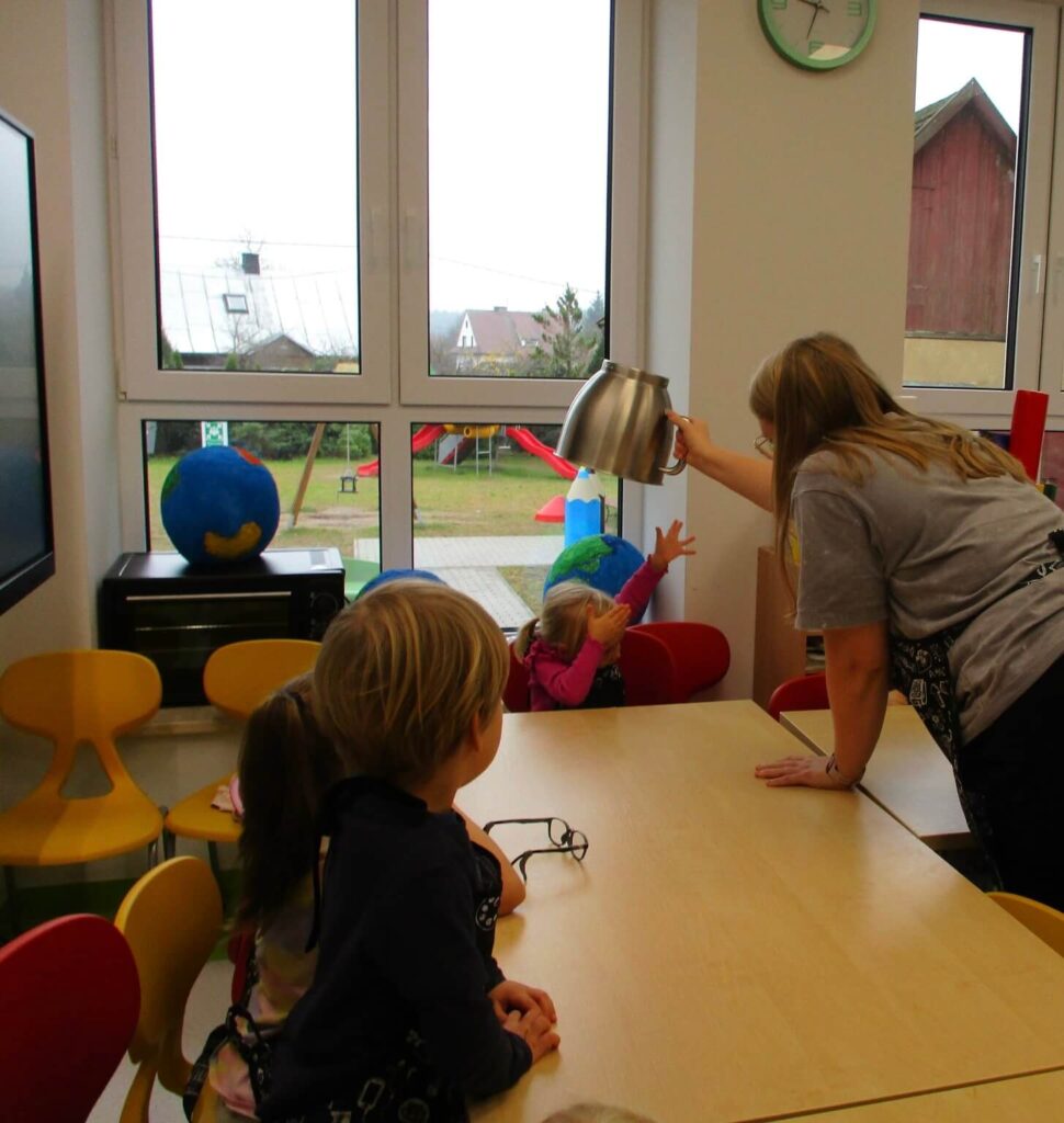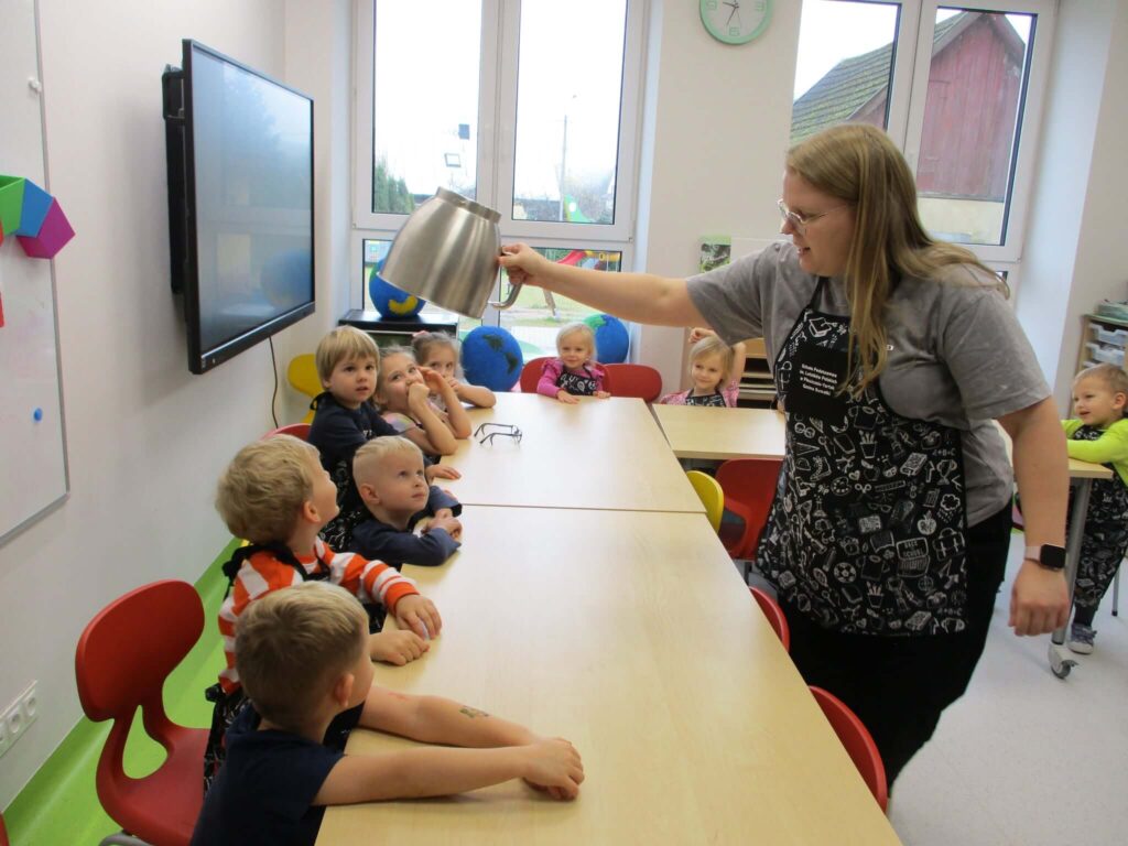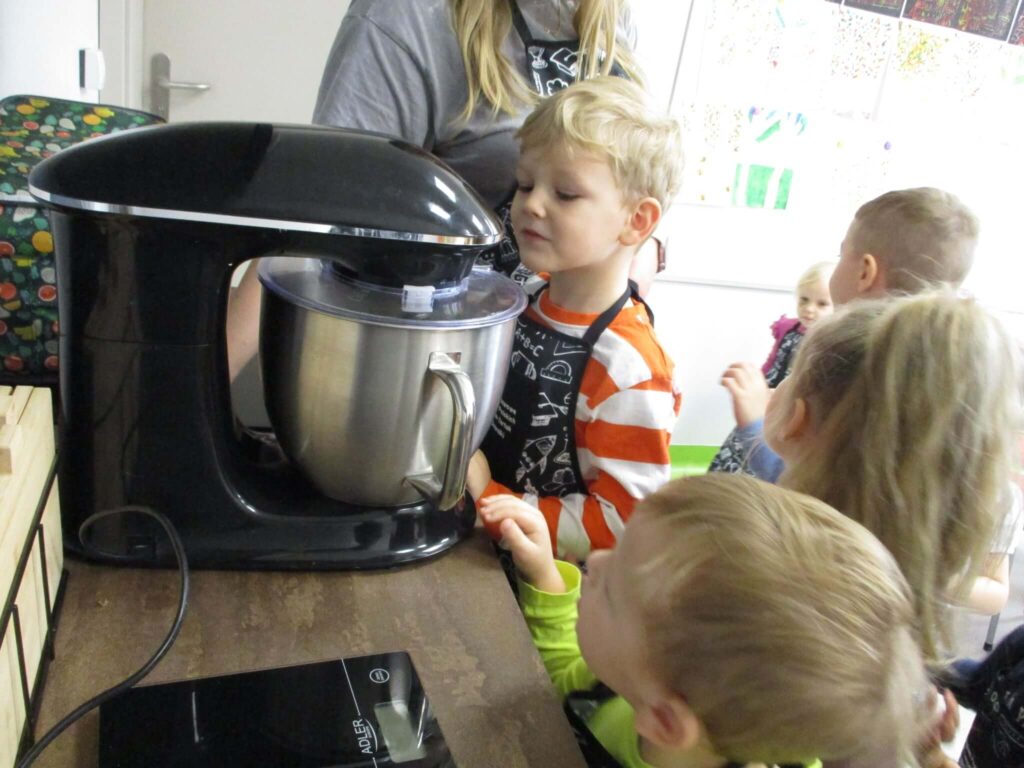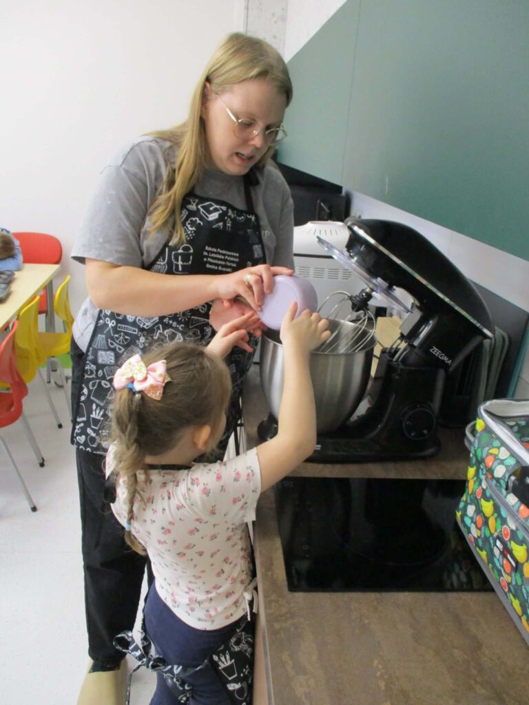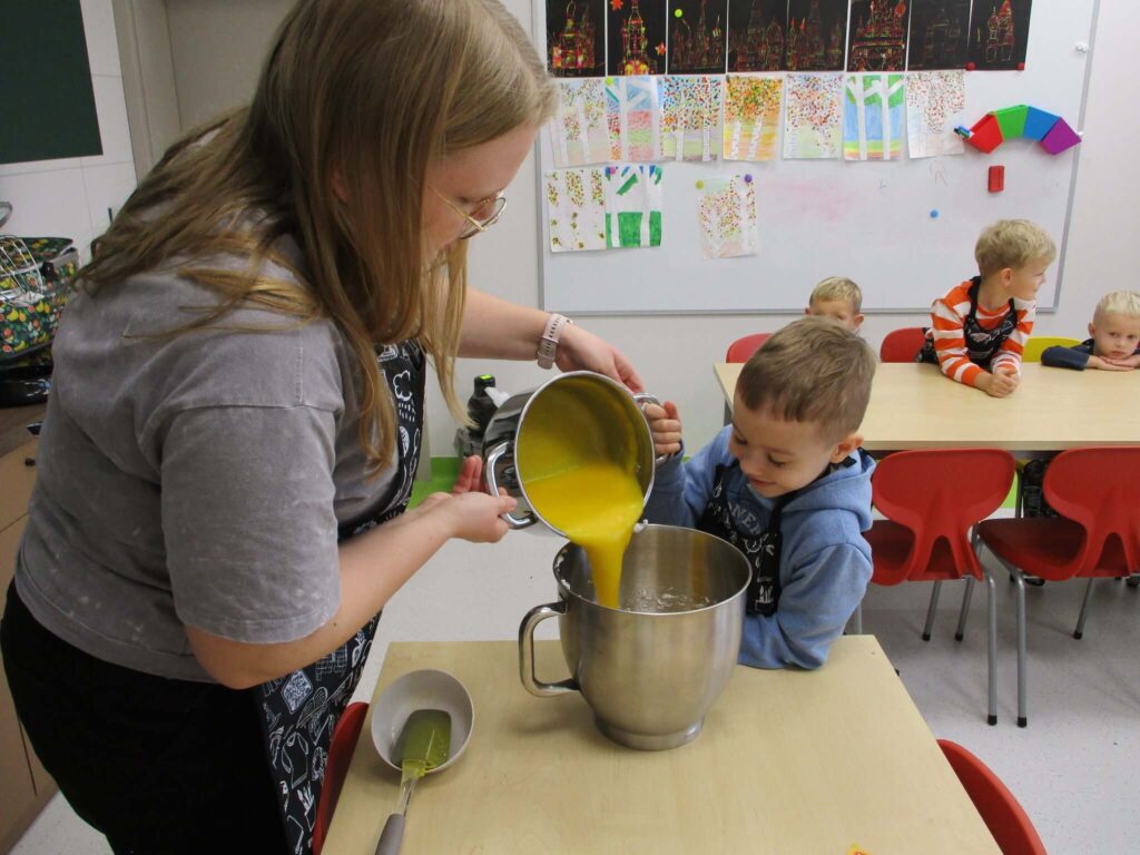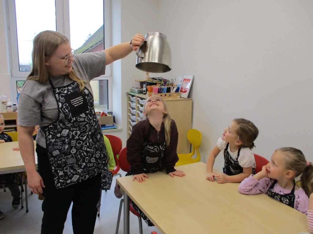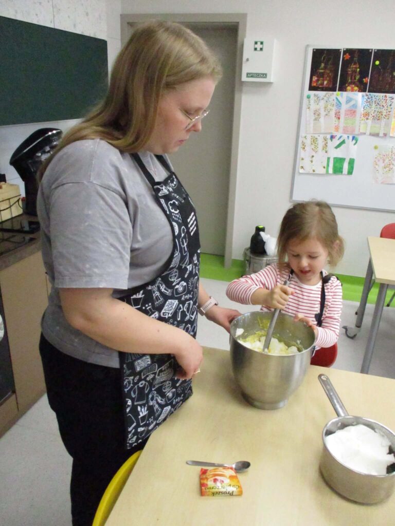 Ależ to był pachnący i radosny dzień! Nasze przedszkolaki zamieniły się w prawdziwych małych cukierników i z zapałem zabrały się za pieczenie dyniowych babeczek. Najpierw wspólnie odmierzały składniki, ucząc się, że w kuchni liczy się precyzja. Najwięcej śmiechu było, gdy poznawaliśmy cukierniczy zwyczaj sprawdzania ubitej piany z białek – oczywiście nad głową! Na szczęście żadna piana nie spadła, a wszystkie dzieci z dumą mogły powiedzieć, że piana była „idealna!”. Po chwili w całym przedszkolu unosił się cudowny zapach pieczonych babeczek, który przyciągał nawet najbardziej głodnych ciekawskich. Na koniec wszyscy z radością zajadali swoje pachnące, złociste wypieki. To był pyszny i pełen uśmiechu dzień!