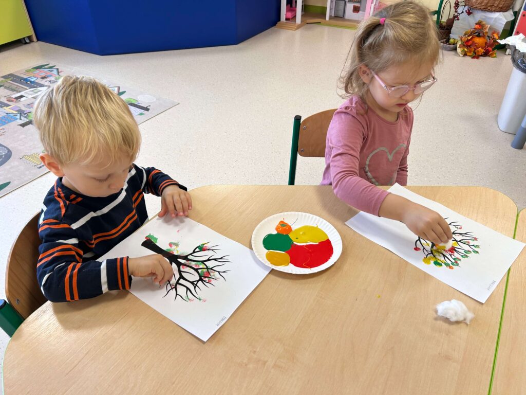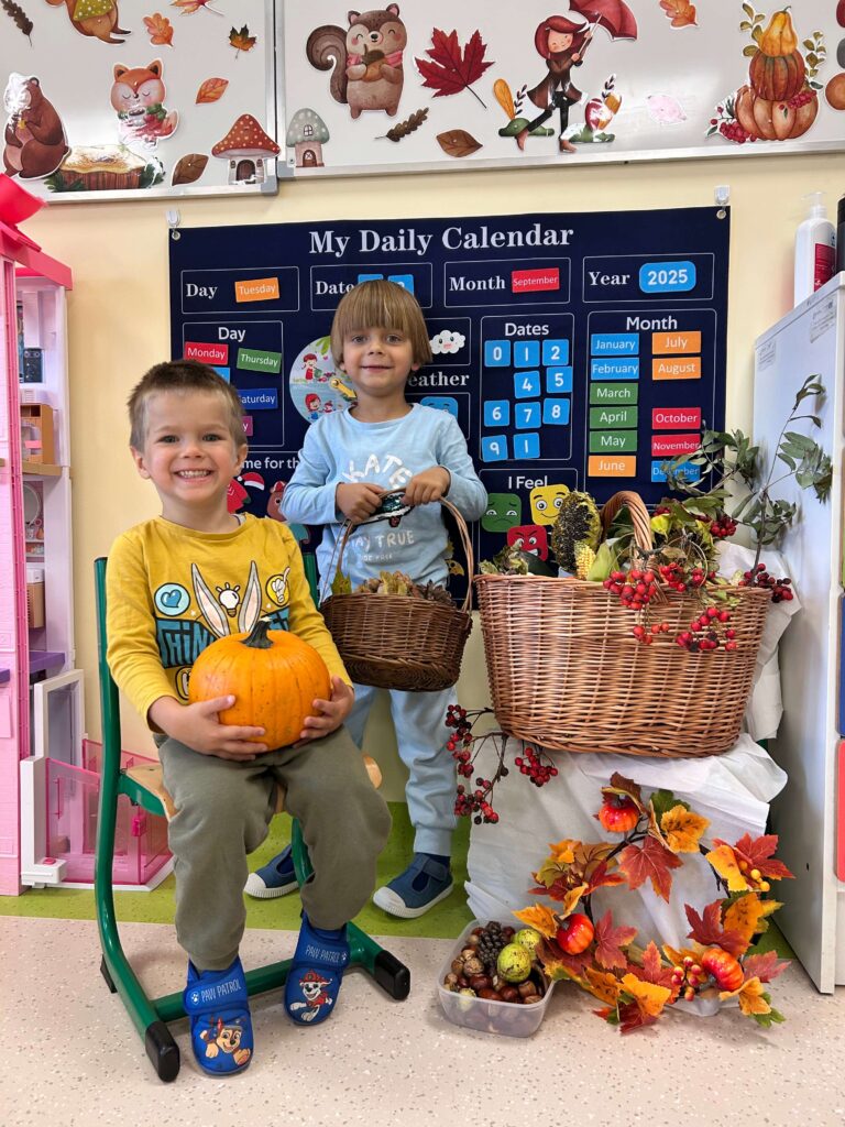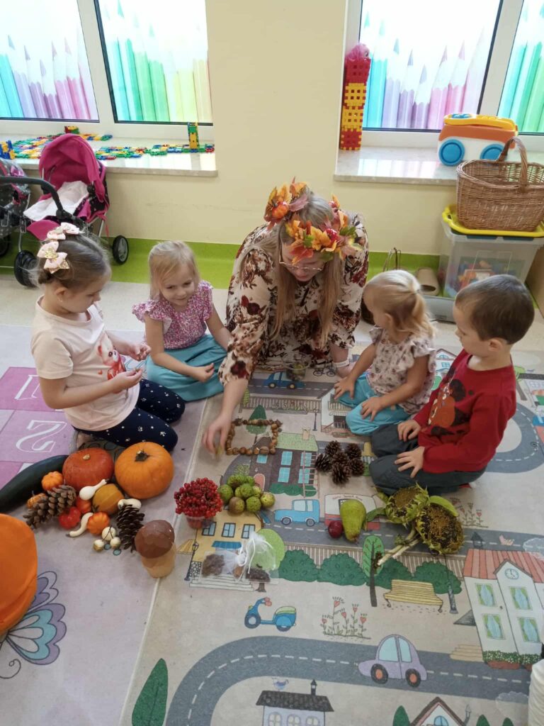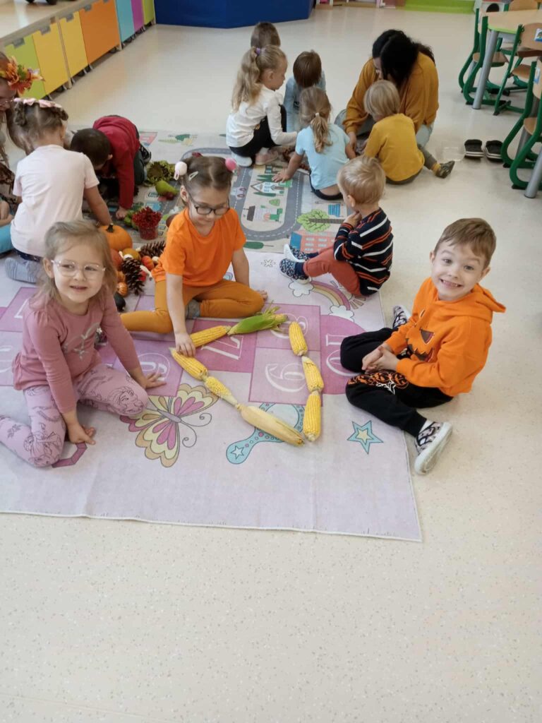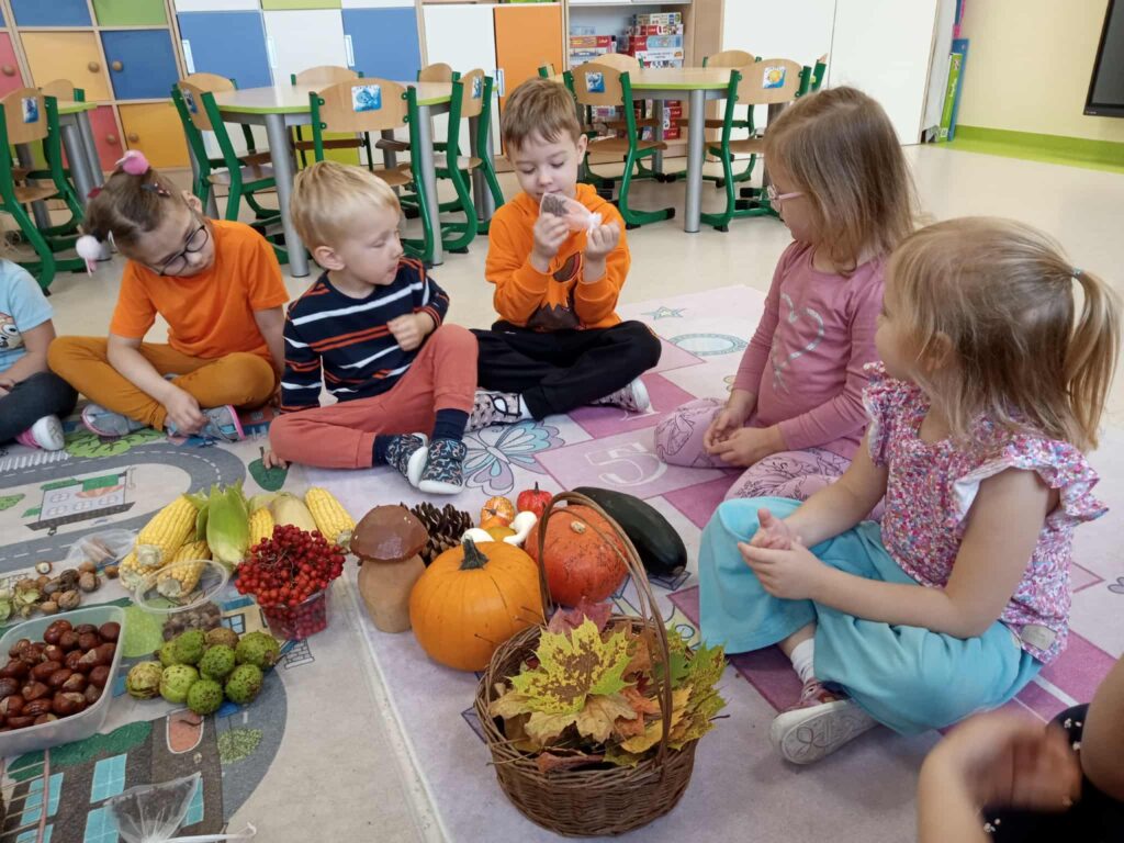 Kasztany próbowały uciekać, dynie udawały ciężarki, a my odkrywaliśmy, że jesień pachnie lepiej niż niejedna perfumeria – trochę jabłkiem, trochę cynamonem, a czasem nawet gruszką. Z darów jesieni układaliśmy różne figury – od prostych kółek po „prawie dzieła sztuki”. Na koniec ruszyła wielka artystyczna misja: trzy różne metody plastyczne i mnóstwo śmiechu przy łączeniu kolorów, malowaniu i kombinowaniu. Jesień, witamy Cię oficjalnie – i obiecujemy, że żaden kasztan już się przed nami nie ukryje!