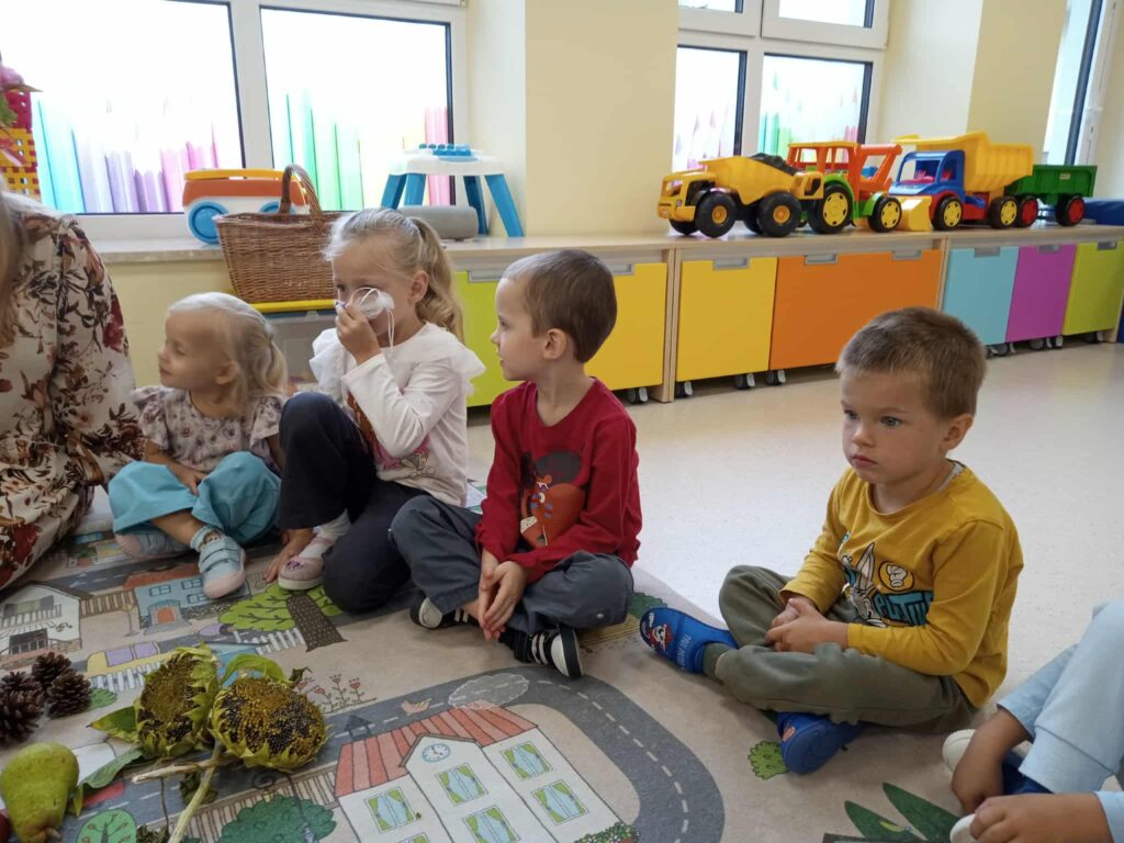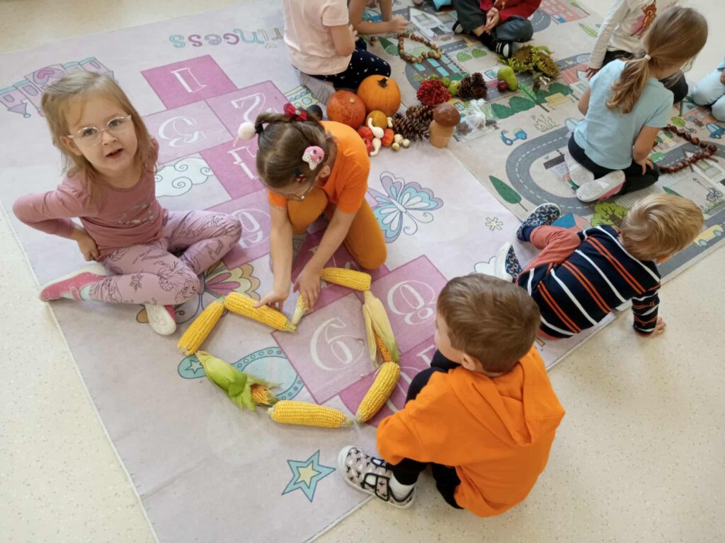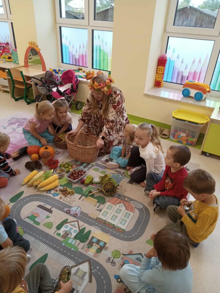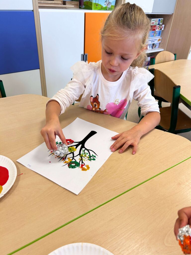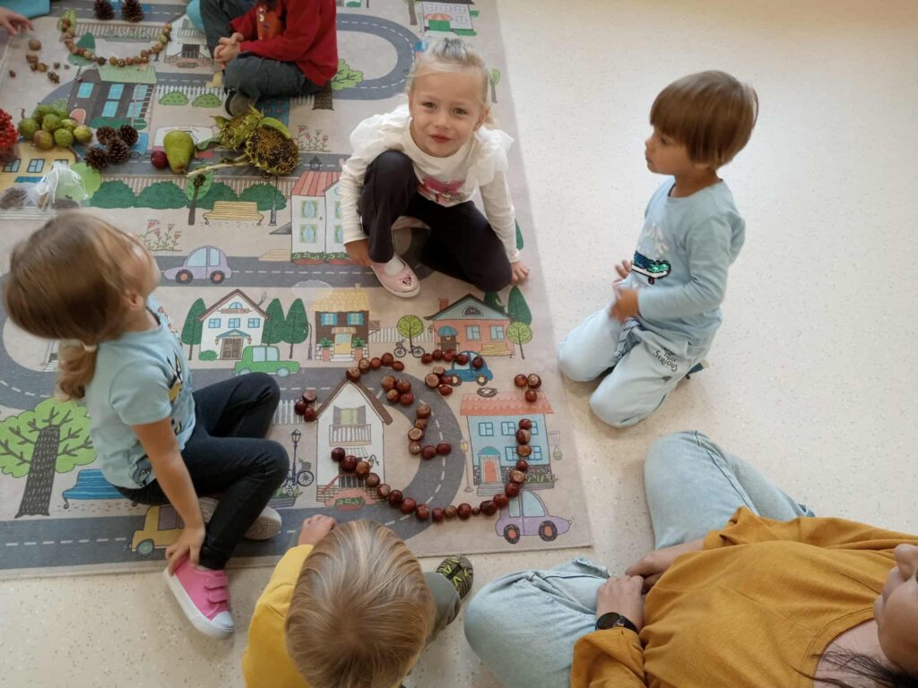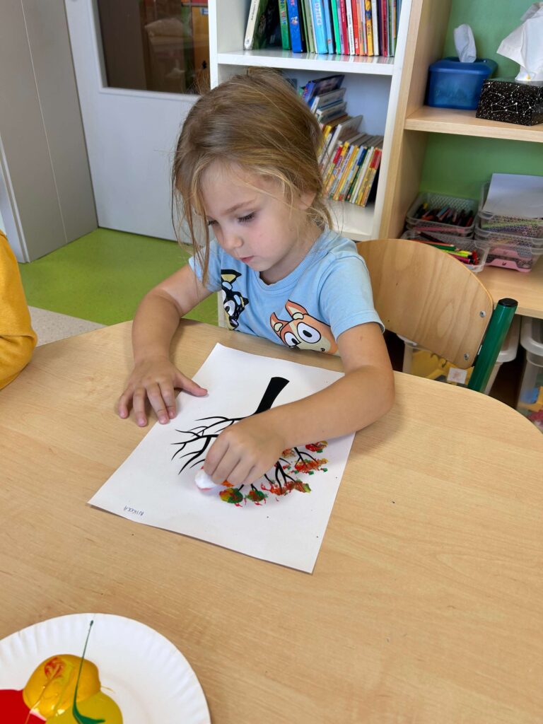 Kasztany próbowały uciekać, dynie udawały ciężarki, a my odkrywaliśmy, że jesień pachnie lepiej niż niejedna perfumeria – trochę jabłkiem, trochę cynamonem, a czasem nawet gruszką. Z darów jesieni układaliśmy różne figury – od prostych kółek po „prawie dzieła sztuki”. Na koniec ruszyła wielka artystyczna misja: trzy różne metody plastyczne i mnóstwo śmiechu przy łączeniu kolorów, malowaniu i kombinowaniu. Jesień, witamy Cię oficjalnie – i obiecujemy, że żaden kasztan już się przed nami nie ukryje!