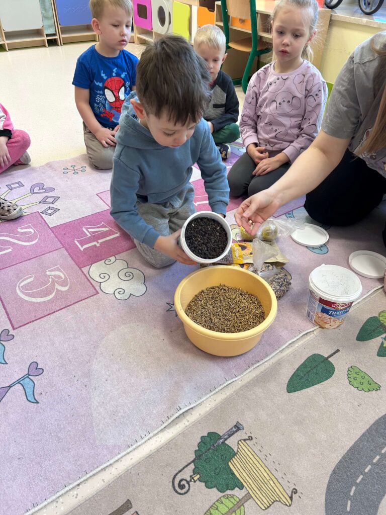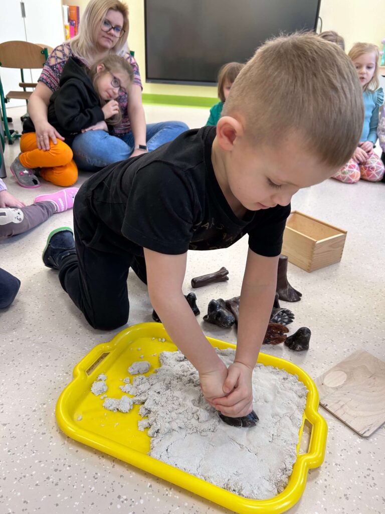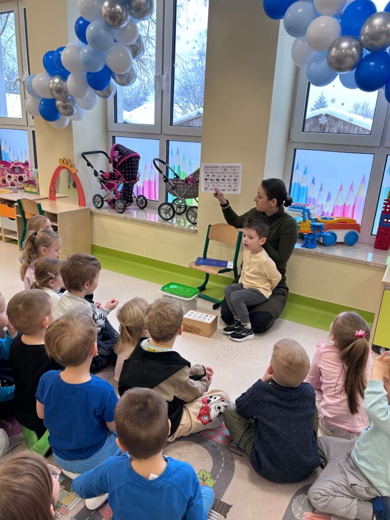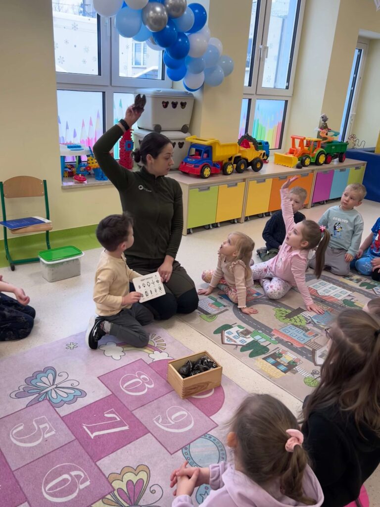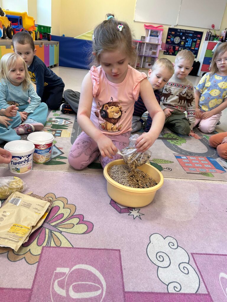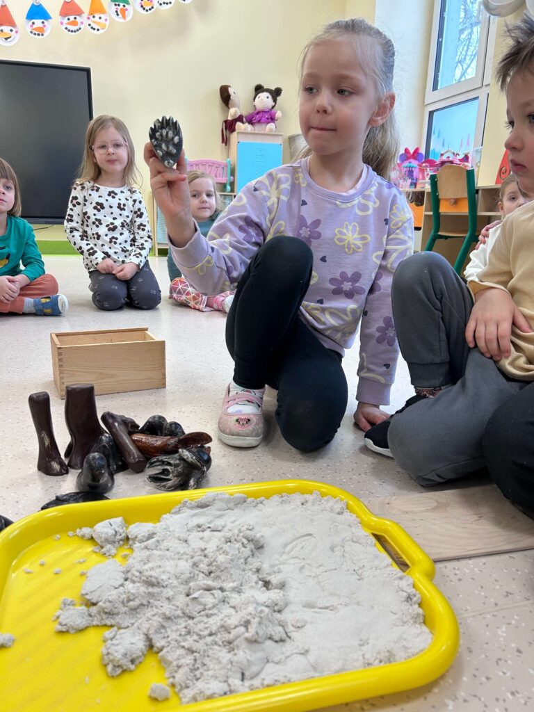 W minionym tygodniu nasze przedszkolaki wzięły udział w wyjątkowym cyklu zajęć przyrodniczych, podczas których zgłębiały tajemnice świata ptaków i zwierząt leśnych. Dzieci uczyły się rozpoznawać ptaki po wyglądzie, dowiedziały się, czym można je dokarmiać oraz jak mądrze pomagać im przetrwać zimowy czas. W ramach zajęć w naszej grupie została zorganizowana zbiórka karmy dla ptaków. Dzięki ogromnemu zaangażowaniu dzieci i rodziców powstała wyjątkowa mieszanka pełna przysmaków – słonecznika, słoniny, orzechów i innych smakołyków. Od tej pory ptaki są codziennie dokarmiane w przedszkolnym karmniku, który chętnie odwiedzają sikorki i sroki. Zwieńczeniem tygodnia było niezwykle ciekawe spotkanie z mamą jednego z przedszkolaków, która na co dzień pracuje jako leśnik. Dzieci dowiedziały się, jakie ślady zostawiają leśne zwierzęta, czym są tropy, jak zwierzęta radzą sobie zimą w lesie oraz w jaki sposób człowiek może im pomóc. To był tydzień pełen wiedzy, radości i rozwijania wrażliwości na przyrodę. Dziękujemy wszystkim za zaangażowanie.