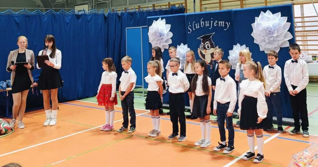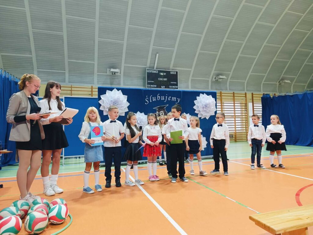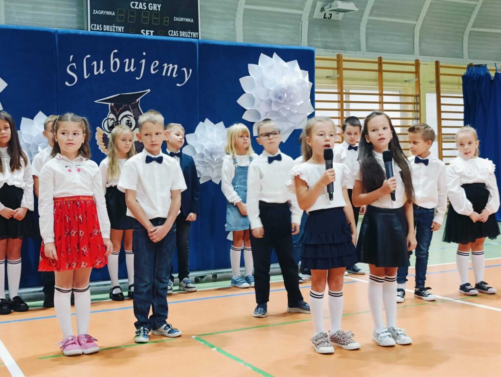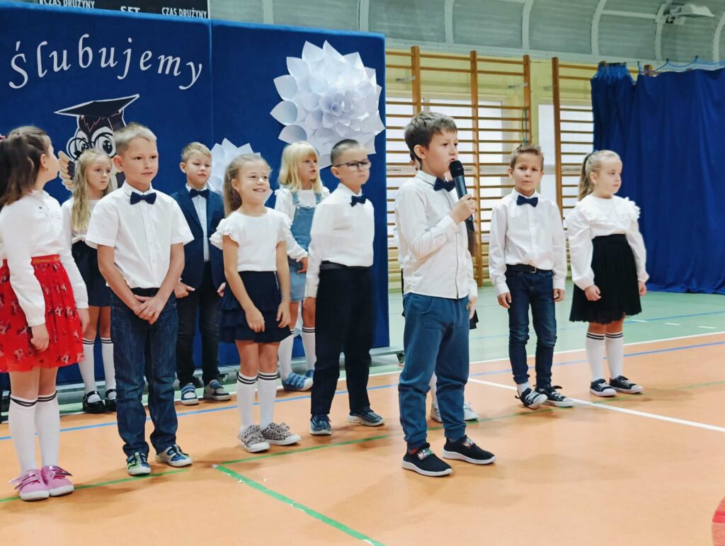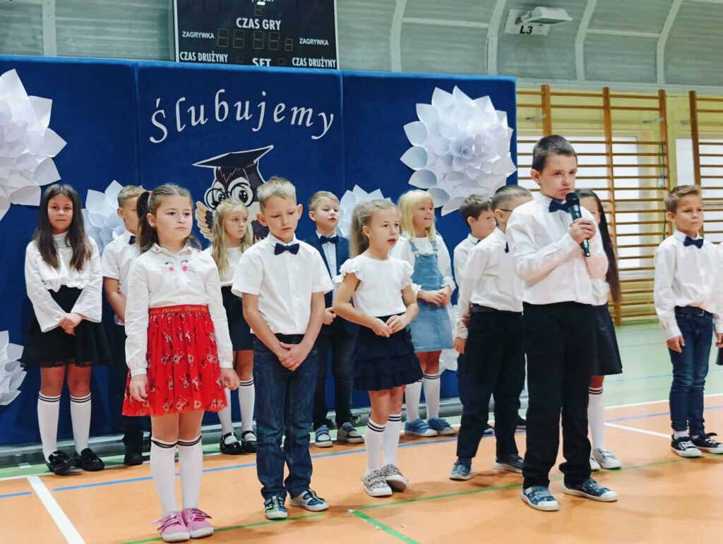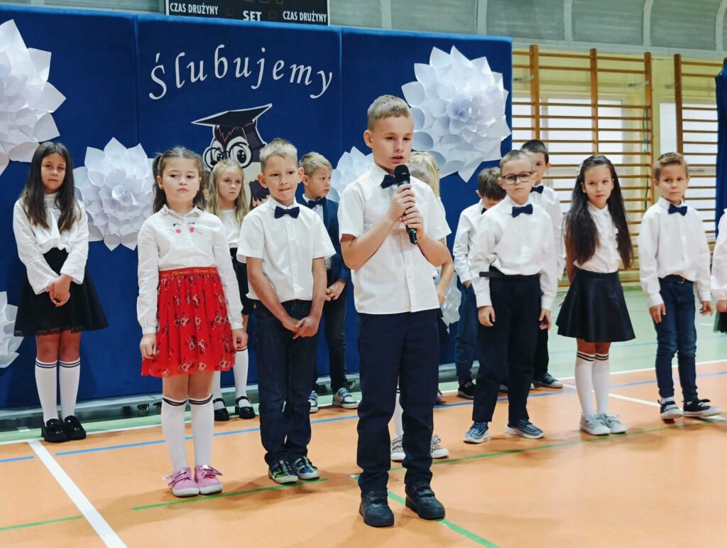 14.10.2024 roku pierwszoklasiści gotowi, odświętnie ubrani i bardzo przejęci przystąpili do zaprezentowania swoich umiejętności. Udowodnili, że potrafią pięknie śpiewać, tańczyć, dodawać i czytać. Posiadają wiedzę o swojej ojczyźnie i znają przepisu ruchu drogowego. W niezwykle podniosłej atmosferze, przed pocztem sztandarowym, pierwszoklasiści ślubowali być dobrymi uczniami i Polakami. Dbać o dobre imię swojej klasy i szkoły.