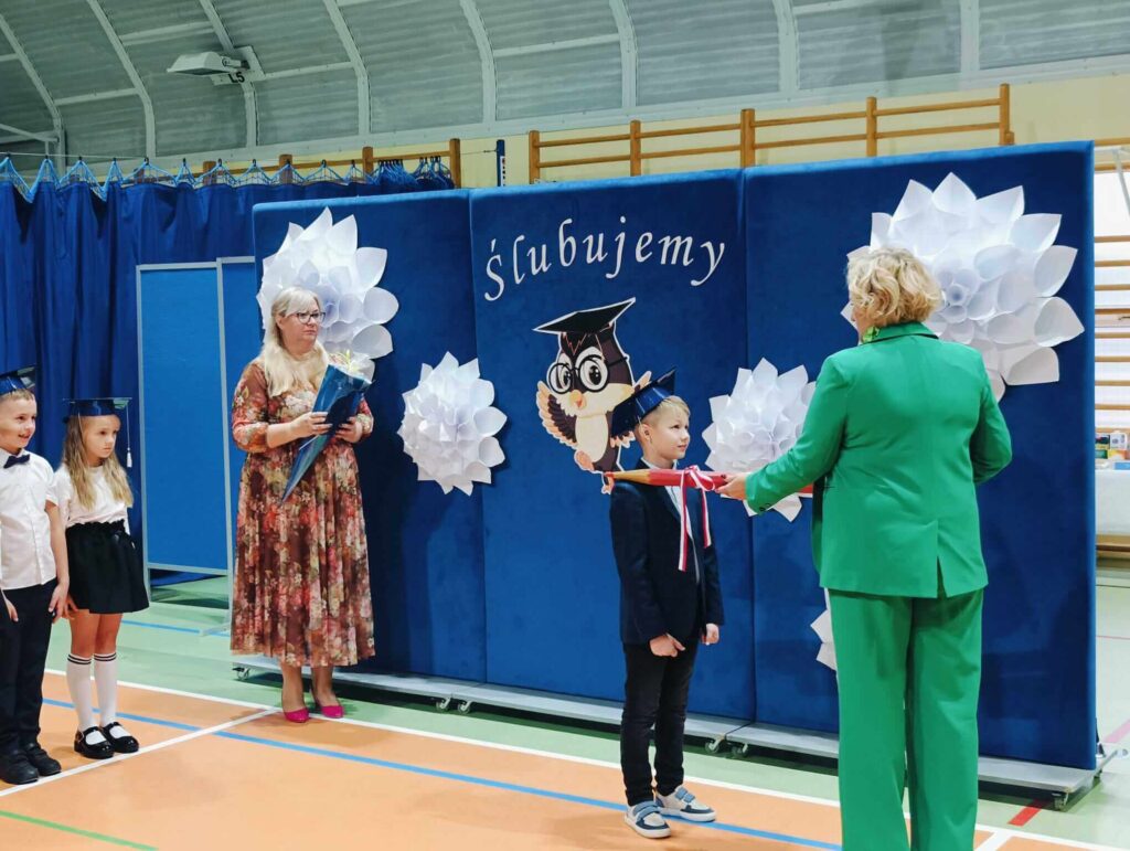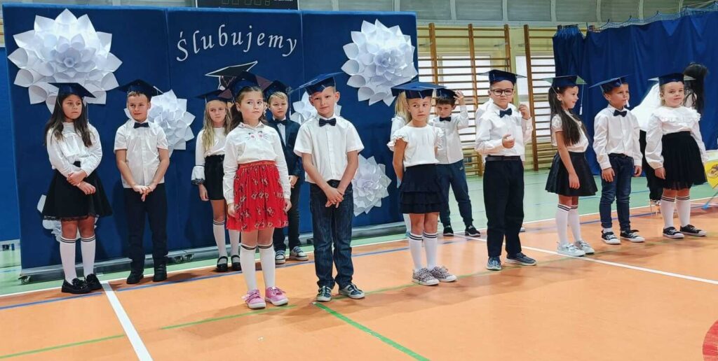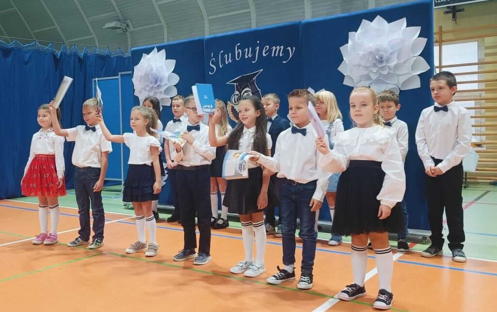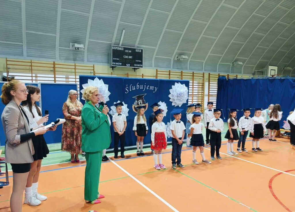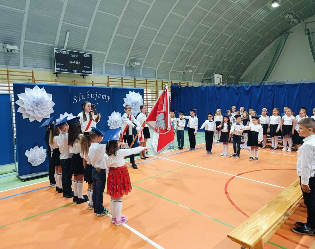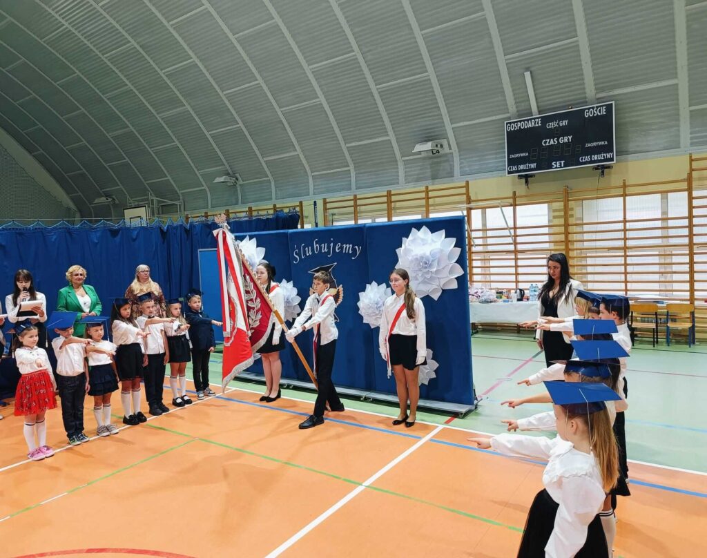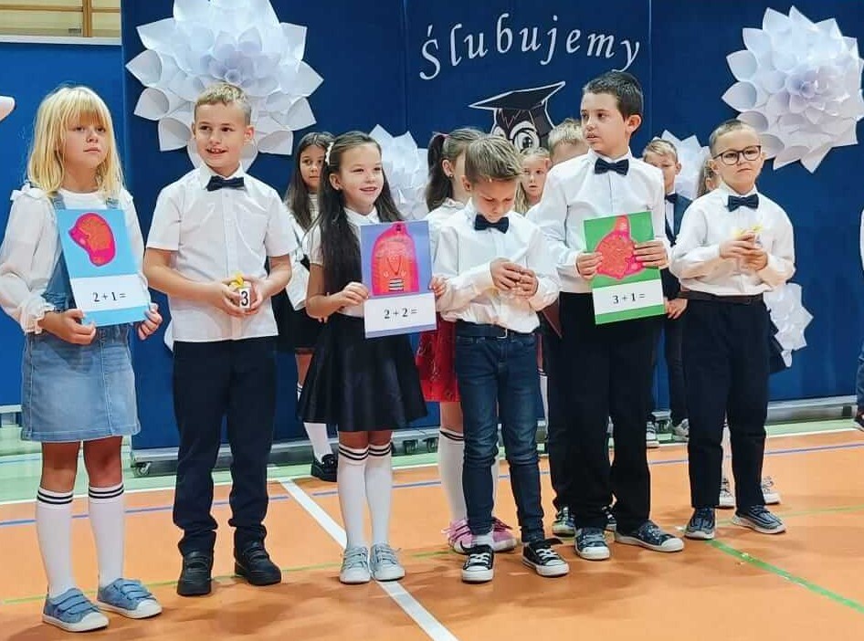 14.10.2024 roku pierwszoklasiści gotowi, odświętnie ubrani i bardzo przejęci przystąpili do zaprezentowania swoich umiejętności. Udowodnili, że potrafią pięknie śpiewać, tańczyć, dodawać i czytać. Posiadają wiedzę o swojej ojczyźnie i znają przepisu ruchu drogowego. W niezwykle podniosłej atmosferze, przed pocztem sztandarowym, pierwszoklasiści ślubowali być dobrymi uczniami i Polakami. Dbać o dobre imię swojej klasy i szkoły.