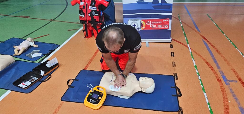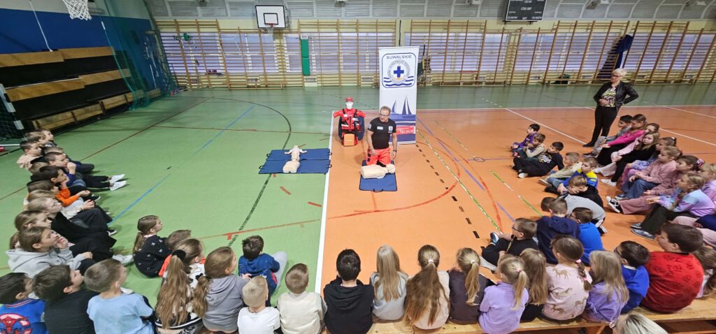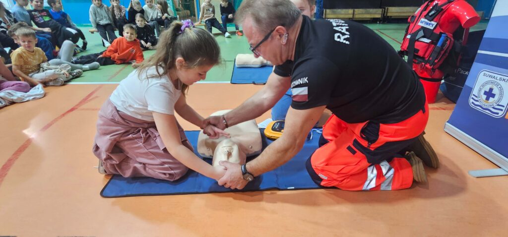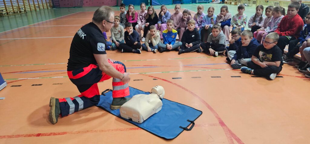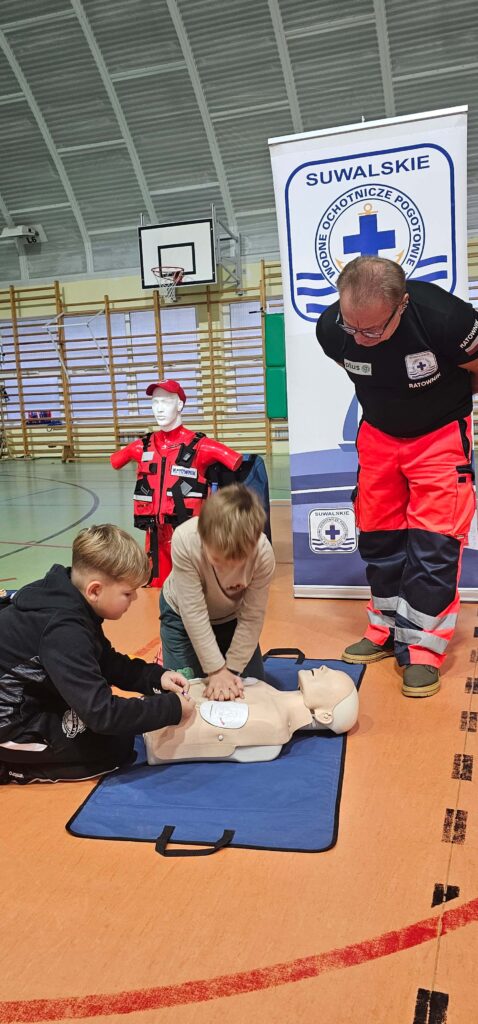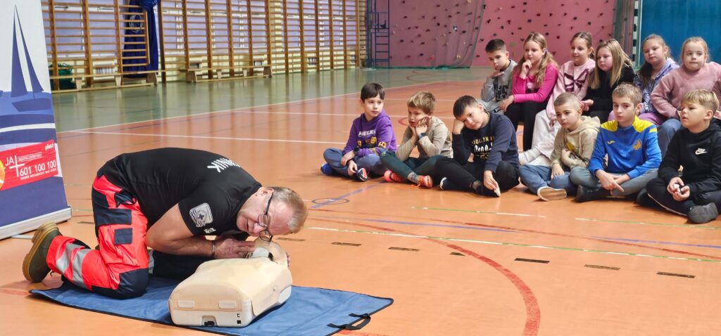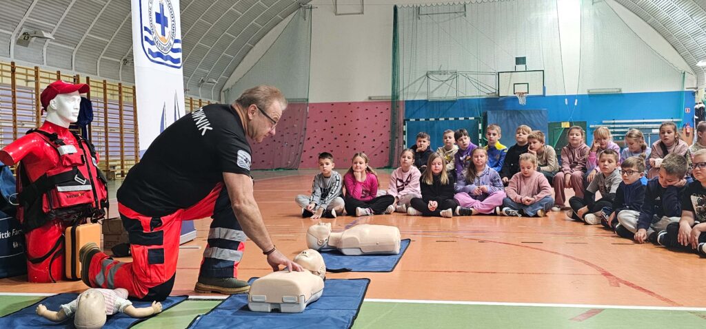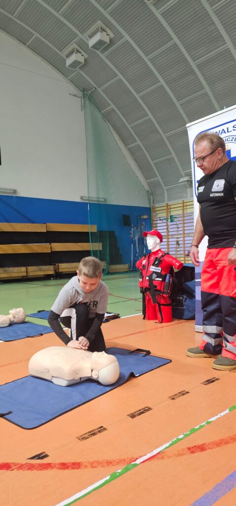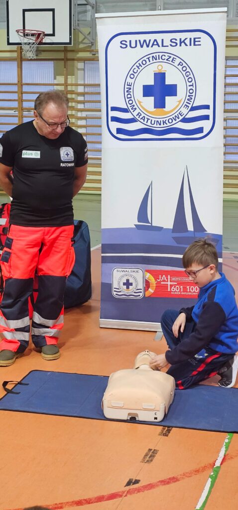 W ramach realizowanego programu Aktywni Błękitni – Szkoła Przyjazna Wodzie odbyły się zajęcia z ratownikiem medycznym, podczas których uczniowie poznali podstawowe zasady udzielania pierwszej pomocy. To była nie tylko teoria, ale przede wszystkim praktyka – każdy mógł spróbować swoich sił w resuscytacji krążeniowo–oddechowej oraz właściwego podłączenia urządzenia AED. Uczniowie byli bardzo zaangażowani, zadawali pytania i chętnie ćwiczyli na fantomach. To spotkanie było prawdziwą lekcją odpowiedzialności i odwagi. Pierwsza pomoc ratuje życie – warto ją znać!