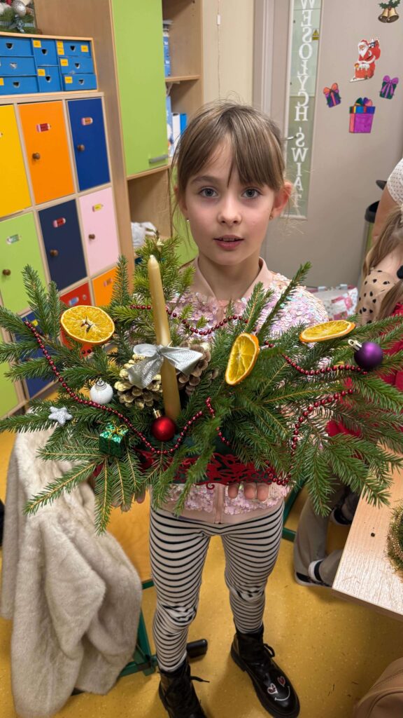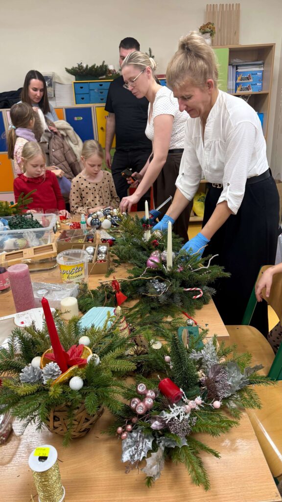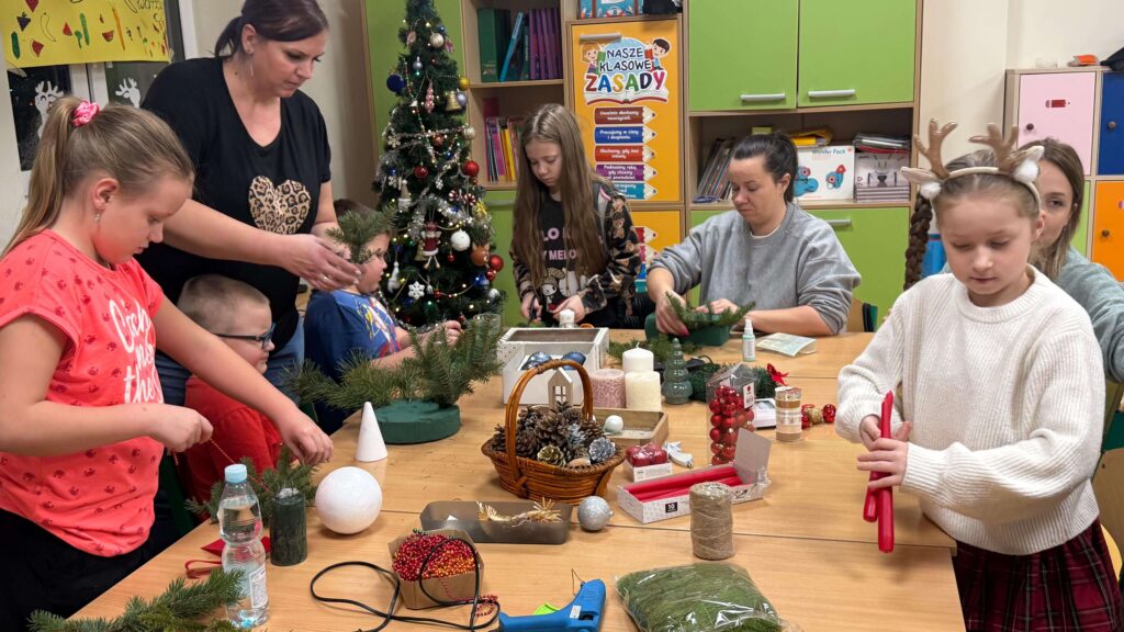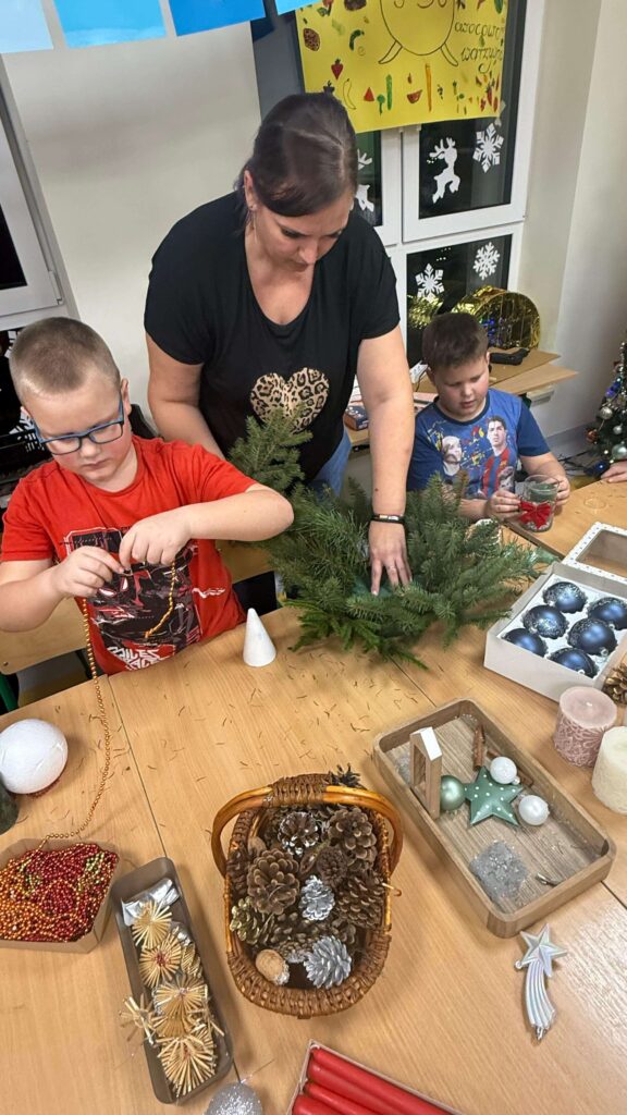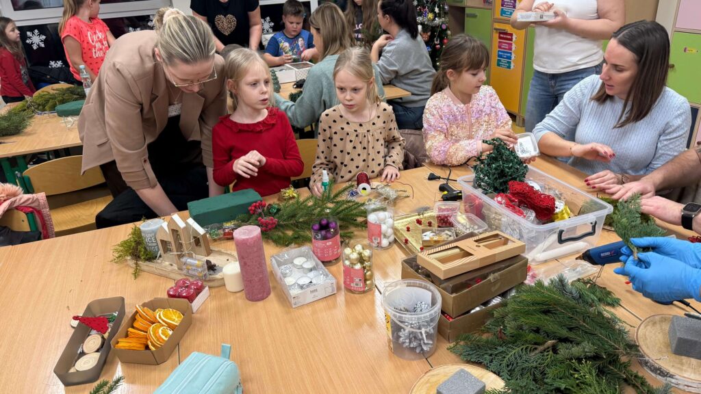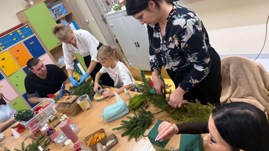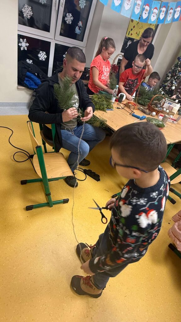 W klasie I odbyły się świąteczne warsztaty z tworzenia stroików bożonarodzeniowych, w których uczestniczyli uczniowie wraz ze swoimi rodzicami. Wydarzenie przebiegło w miłej, ciepłej atmosferze i stanowiło doskonałą okazję do integracji społeczności szkolnej. Podczas warsztatów dzieci wspólnie z rodzicami z dużym zaangażowaniem wykonywały stroiki świąteczne, wykorzystując naturalne materiały, takie jak gałązki świerku, szyszki oraz różnorodne dekoracje. Wykonane stroiki zachwycały estetyką i pomysłowością, a wspólna praca sprzyjała rozwijaniu kreatywności, wzmacnianiu więzi rodzinnych oraz kształtowaniu umiejętności współpracy.