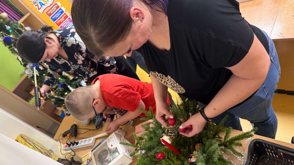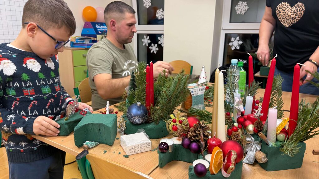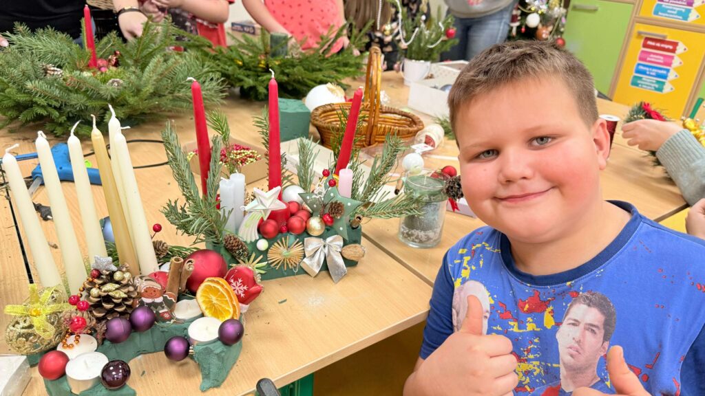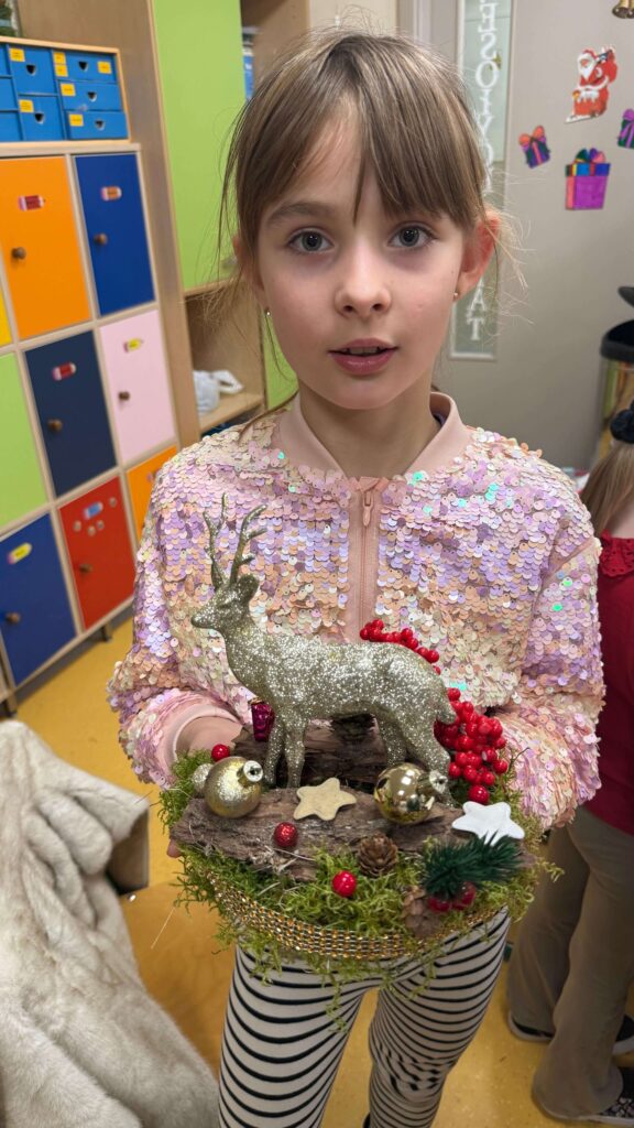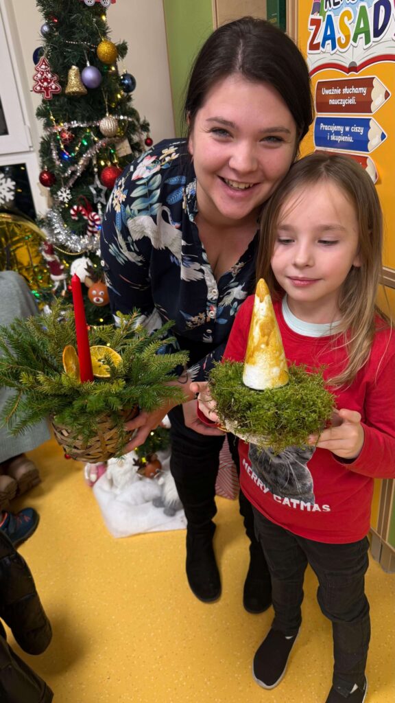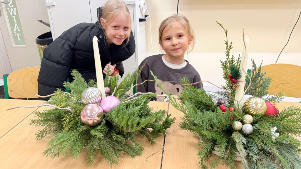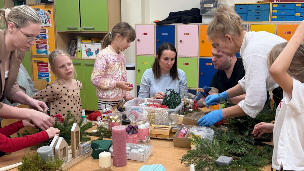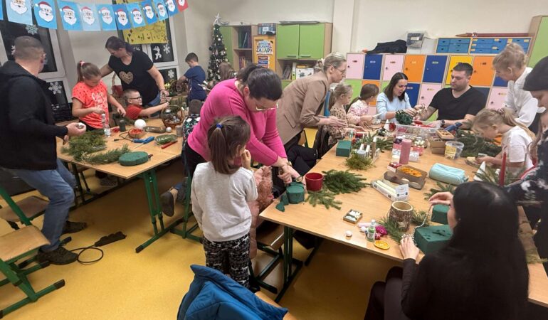 W klasie I odbyły się świąteczne warsztaty z tworzenia stroików bożonarodzeniowych, w których uczestniczyli uczniowie wraz ze swoimi rodzicami. Wydarzenie przebiegło w miłej, ciepłej atmosferze i stanowiło doskonałą okazję do integracji społeczności szkolnej. Podczas warsztatów dzieci wspólnie z rodzicami z dużym zaangażowaniem wykonywały stroiki świąteczne, wykorzystując naturalne materiały, takie jak gałązki świerku, szyszki oraz różnorodne dekoracje. Wykonane stroiki zachwycały estetyką i pomysłowością, a wspólna praca sprzyjała rozwijaniu kreatywności, wzmacnianiu więzi rodzinnych oraz kształtowaniu umiejętności współpracy.