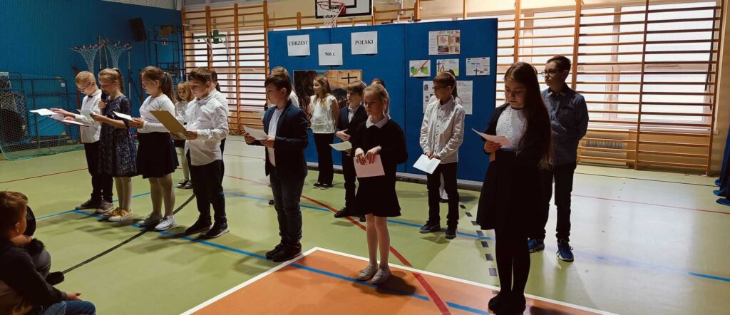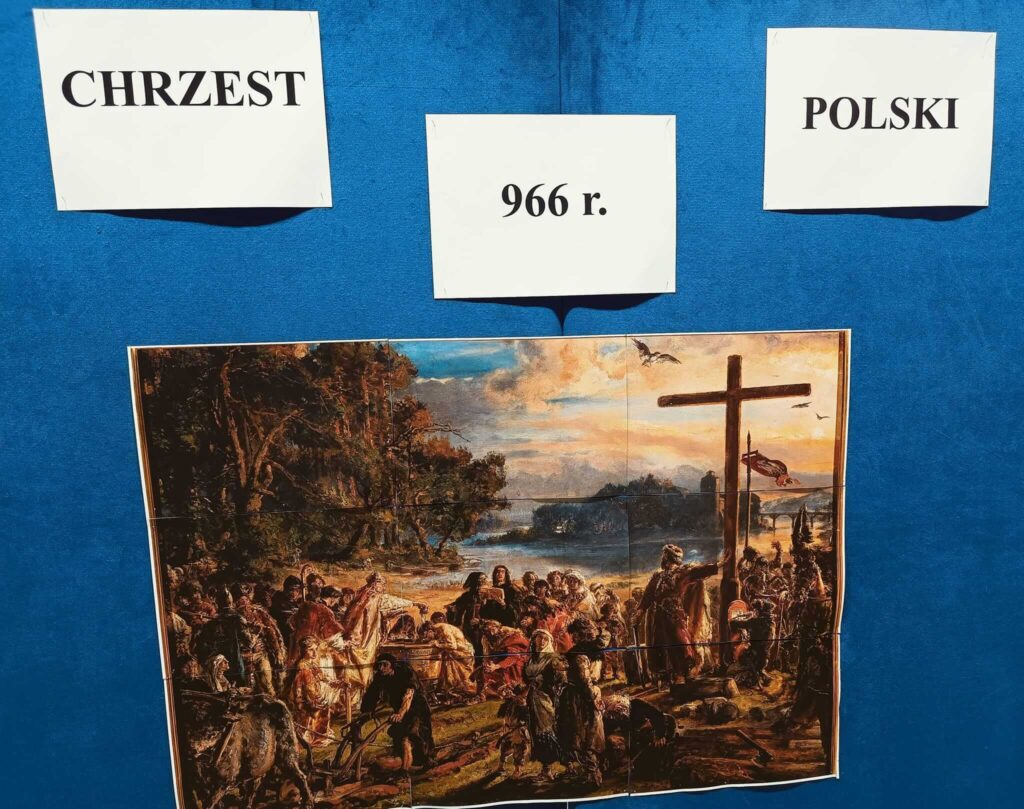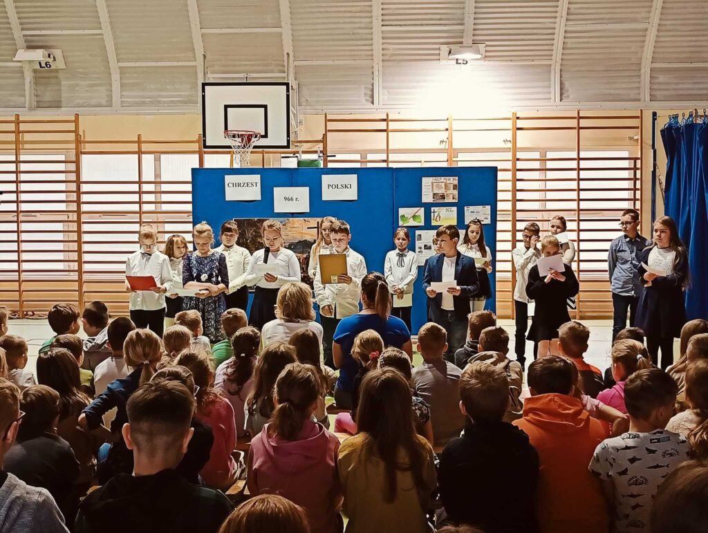 Dziś uroczyście obchodziliśmy Święto Chrztu Polski. Data 14.04.966 r. to jedna z najważniejszych wydarzeń w historii Polski. To święto ma na celu upamiętnianie wydarzeń o naszych chrześcijańskich korzeniach. Jest to wspaniała okazja do wzbudzenia wśród uczniów refleksji nad odpowiedzialnością za przyszłość polskiego narodu.