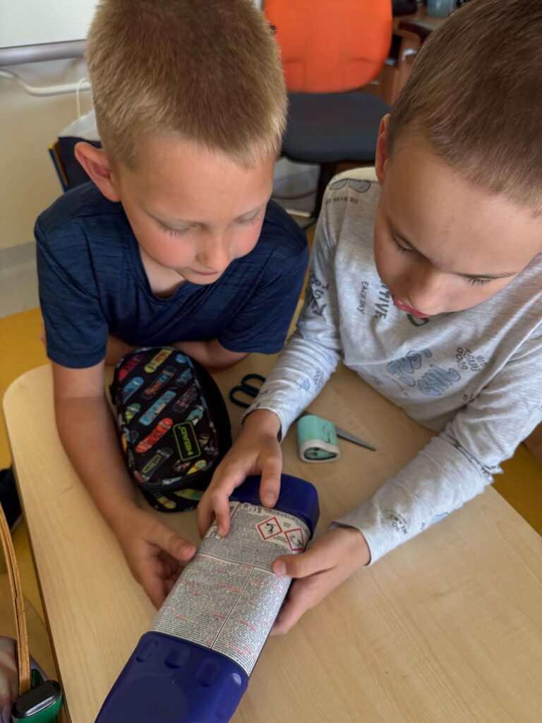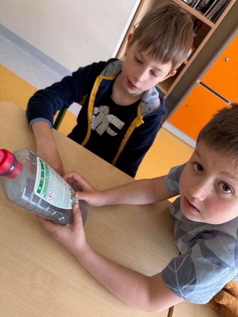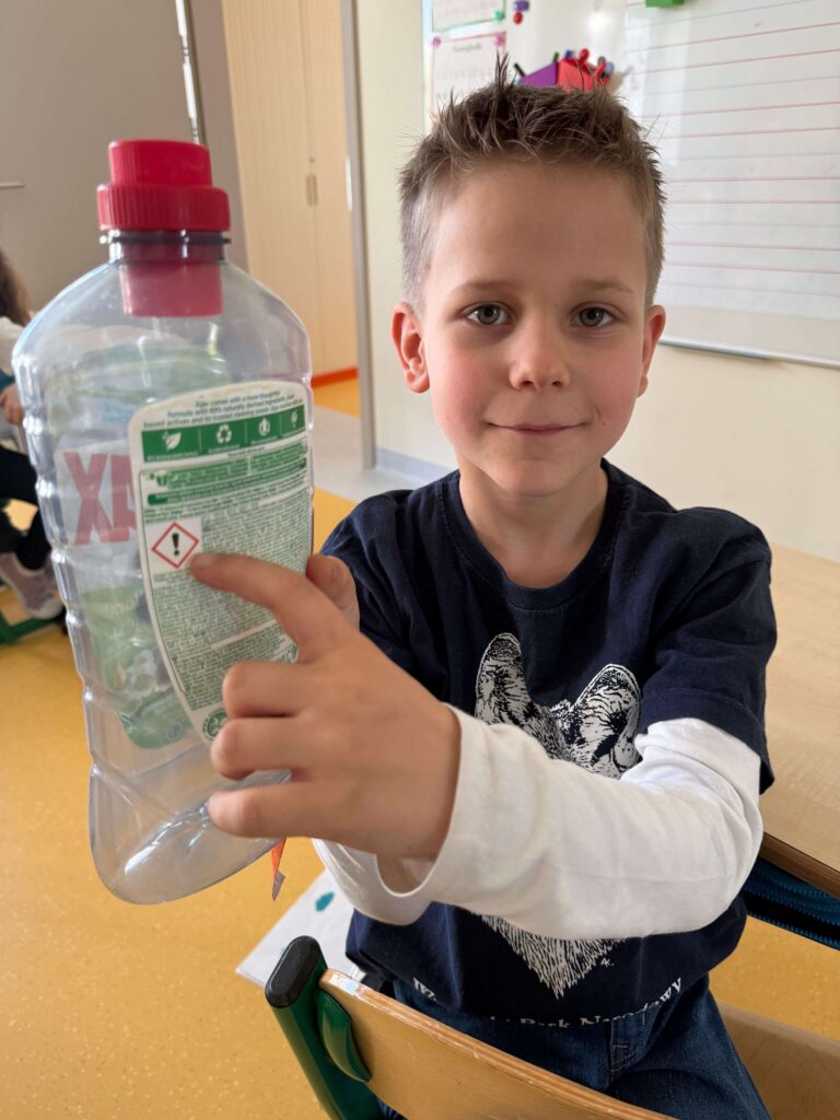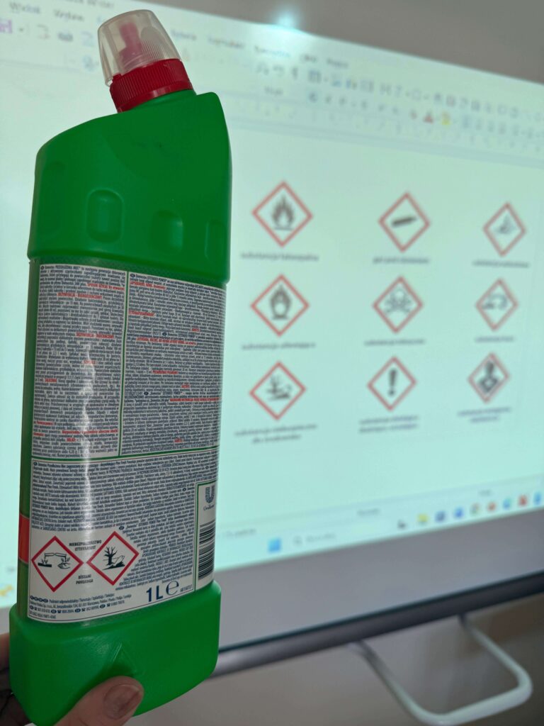 Uczniowie klasy pierwszej w ramach innowacji „Metki i piktogramy czytamy wszystkie tajniki poznamy” poznali oznaczenia odczynników chemicznych (piktogramy). Obserwacja z bliska produktów chemicznych tj. kapsułki do prania, płyny do prania, płukania, dezynfekcji, szorowania brudnych powierzchni i różne kosmetyki pozwoliła zwrócić uwagę uczniów na oznaczenia znajdujące się na etykietach umieszczonych na pojemnikach, w których są odczynniki chemiczne. Było tam wiele kwadratowych piktogramów z czerwoną obwódką np. substancja łatwopalna, żrąca lub niebezpieczna dla środowiska. To produkty, których dzieci same nie mogą używać ze względu na bezpieczeństwo swoje i innych. Nasza rada dla każdego: Zwracaj uwagę na oznaczenia znajdujące się na etykietach umieszczonych na pojemnikach, w których są odczynniki chemiczne! Bądź ostrożny!