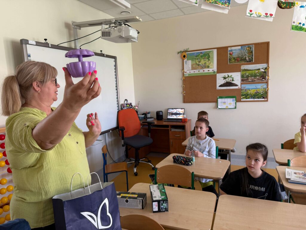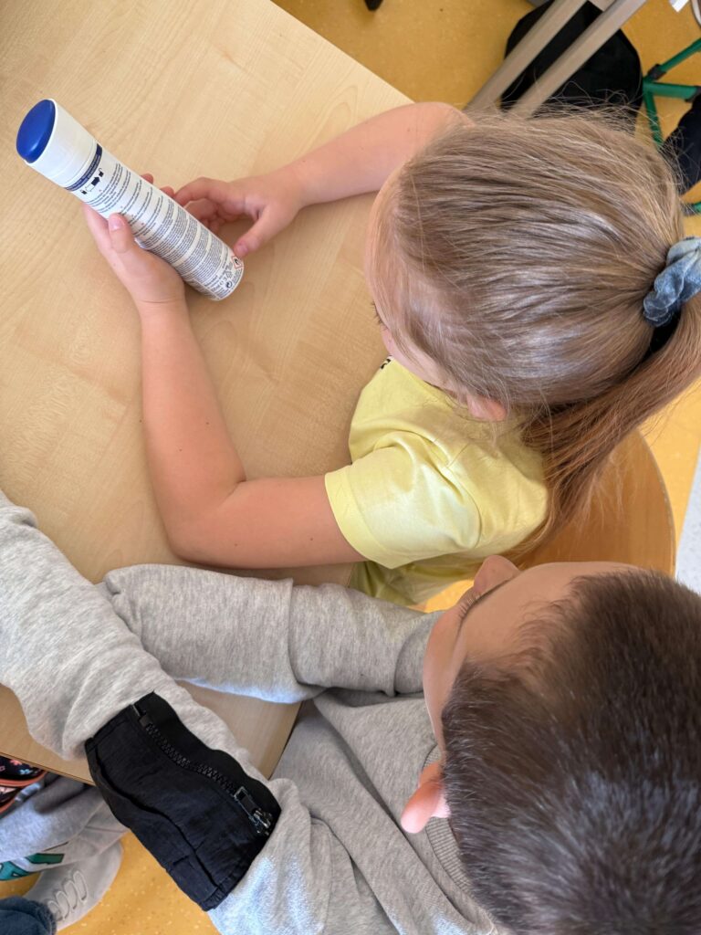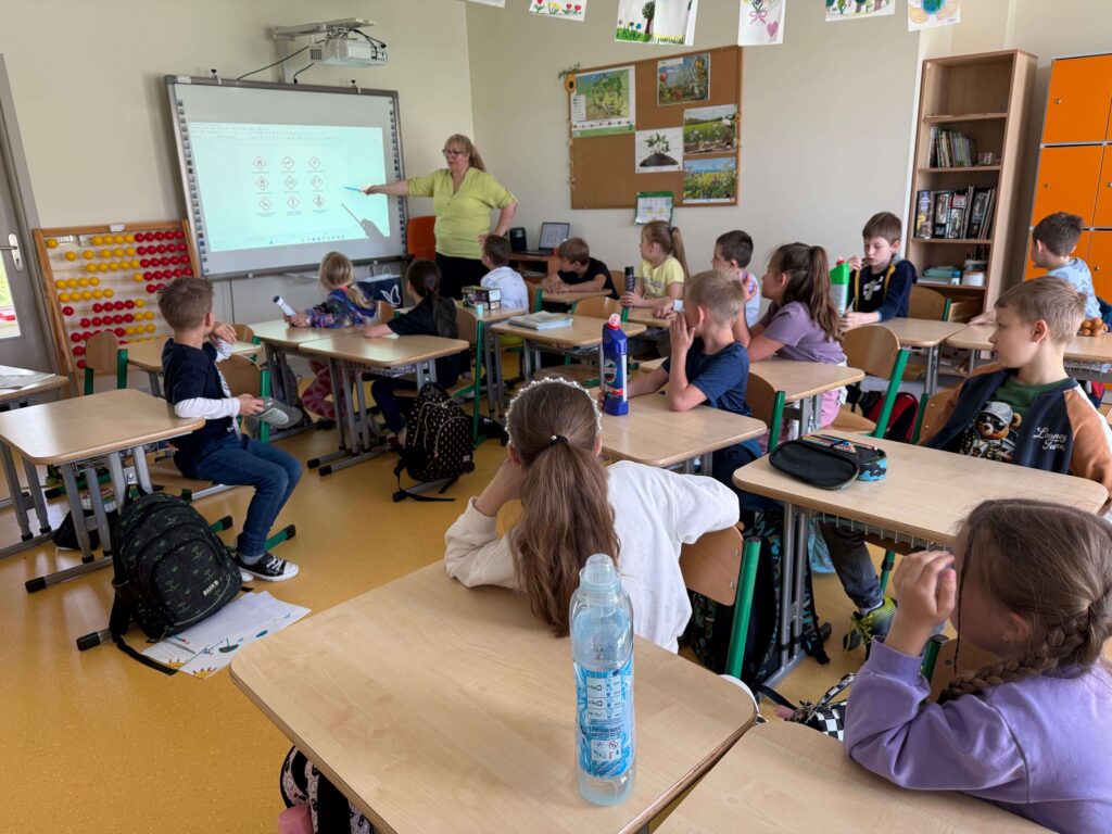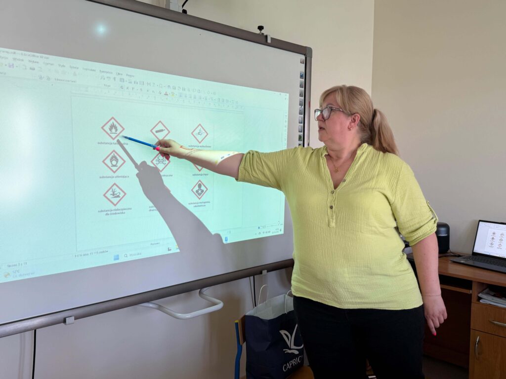 Uczniowie klasy pierwszej w ramach innowacji „Metki i piktogramy czytamy wszystkie tajniki poznamy” poznali oznaczenia odczynników chemicznych (piktogramy). Obserwacja z bliska produktów chemicznych tj. kapsułki do prania, płyny do prania, płukania, dezynfekcji, szorowania brudnych powierzchni i różne kosmetyki pozwoliła zwrócić uwagę uczniów na oznaczenia znajdujące się na etykietach umieszczonych na pojemnikach, w których są odczynniki chemiczne. Było tam wiele kwadratowych piktogramów z czerwoną obwódką np. substancja łatwopalna, żrąca lub niebezpieczna dla środowiska. To produkty, których dzieci same nie mogą używać ze względu na bezpieczeństwo swoje i innych. Nasza rada dla każdego: Zwracaj uwagę na oznaczenia znajdujące się na etykietach umieszczonych na pojemnikach, w których są odczynniki chemiczne! Bądź ostrożny!