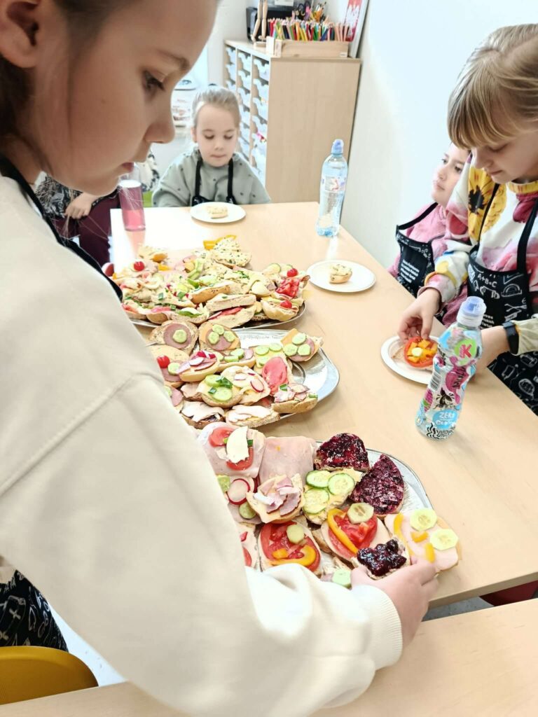 Najwięcej radości sprawiło im dekorowanie kanapek kolorowymi warzywami, dzięki którym powstały prawdziwe, wiosenne dzieła sztuki. Na talerzach pojawiły się uśmiechnięte buzie, kwiatki i różnorodne kompozycje pełne barw.Na zakończenie wszyscy wspólnie zasiedli do stołu, by spróbować swoich pysznych i zdrowych kanapek. To był dzień pełen radości, współpracy i świetnej zabawy!
