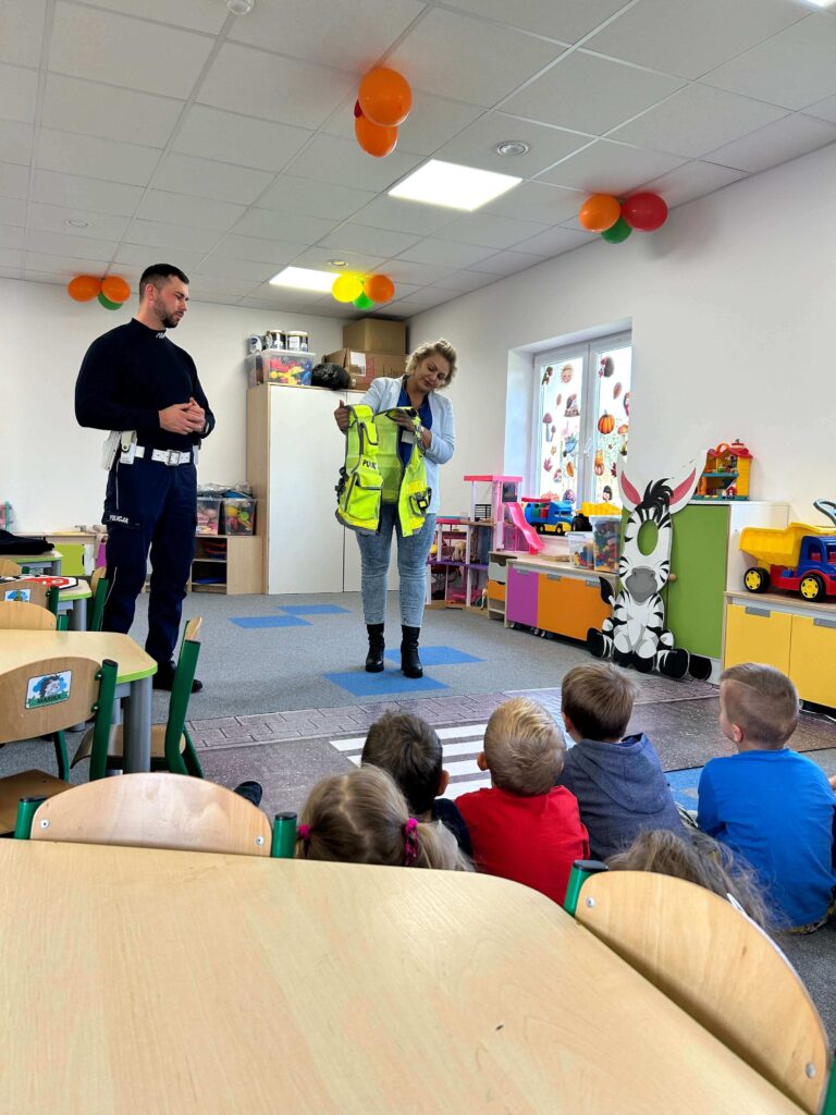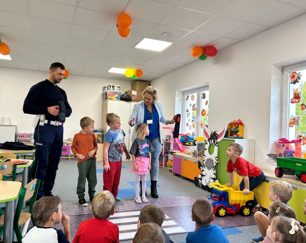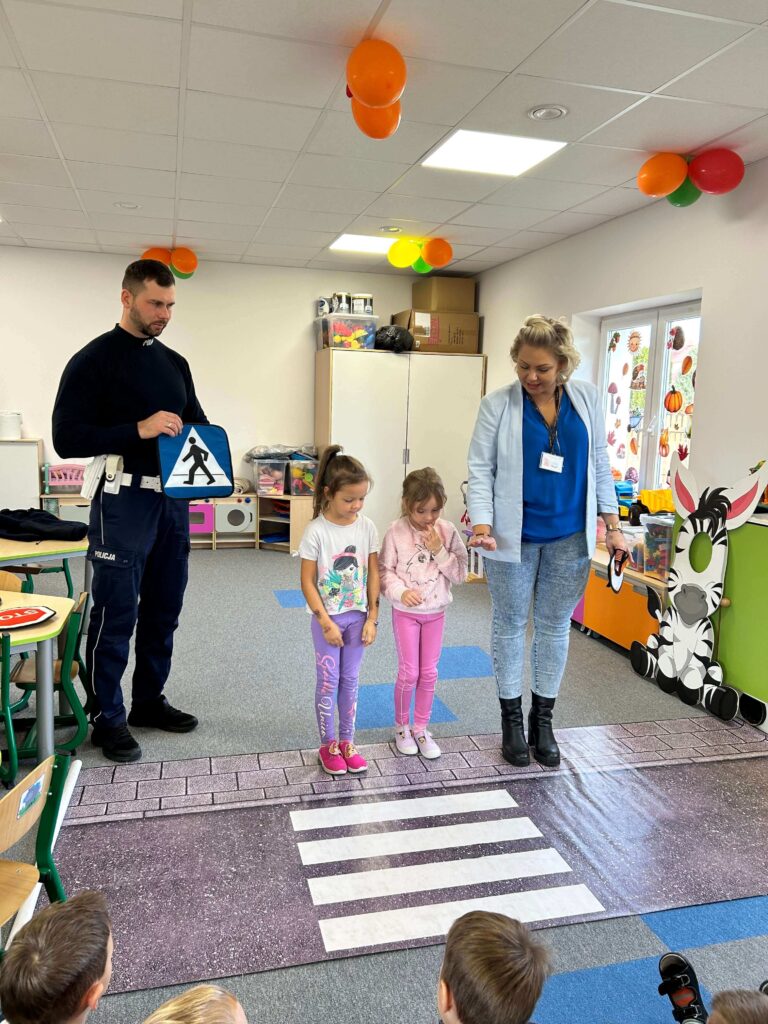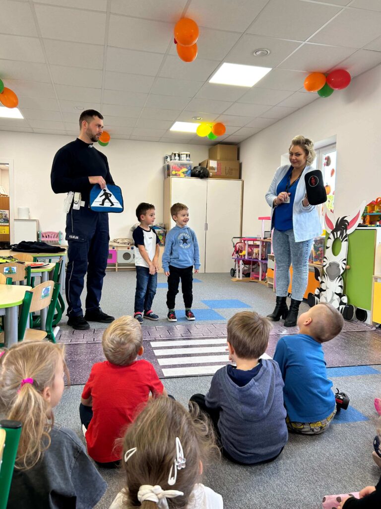 W poniedziałek mieliśmy zaszczyt gościć w naszym punkcie przedszkolnym i oddziale przedszkolnym funkcjonariusza z Komendy Miejskiej Policji w Suwałkach. W tym dniu dzieci utrwaliły swoją wiedzę na temat poruszania się w ruchu drogowym, przypomniały znaczenie znaków drogowych oraz poznały podstawowe zasady bezpieczeństwa. Na koniec zajęć dzieci mogły wykonać zdjęcie w symbolicznej biało-czarnej zebrze.