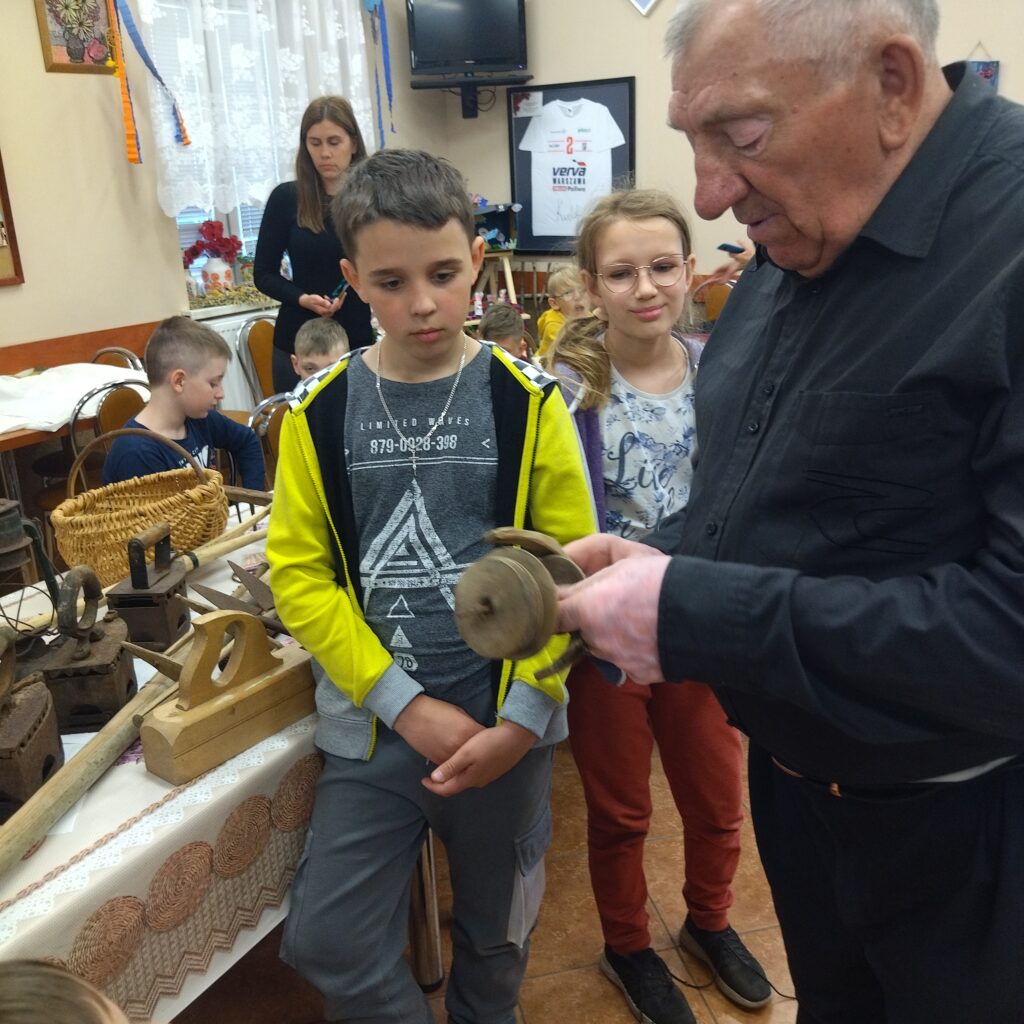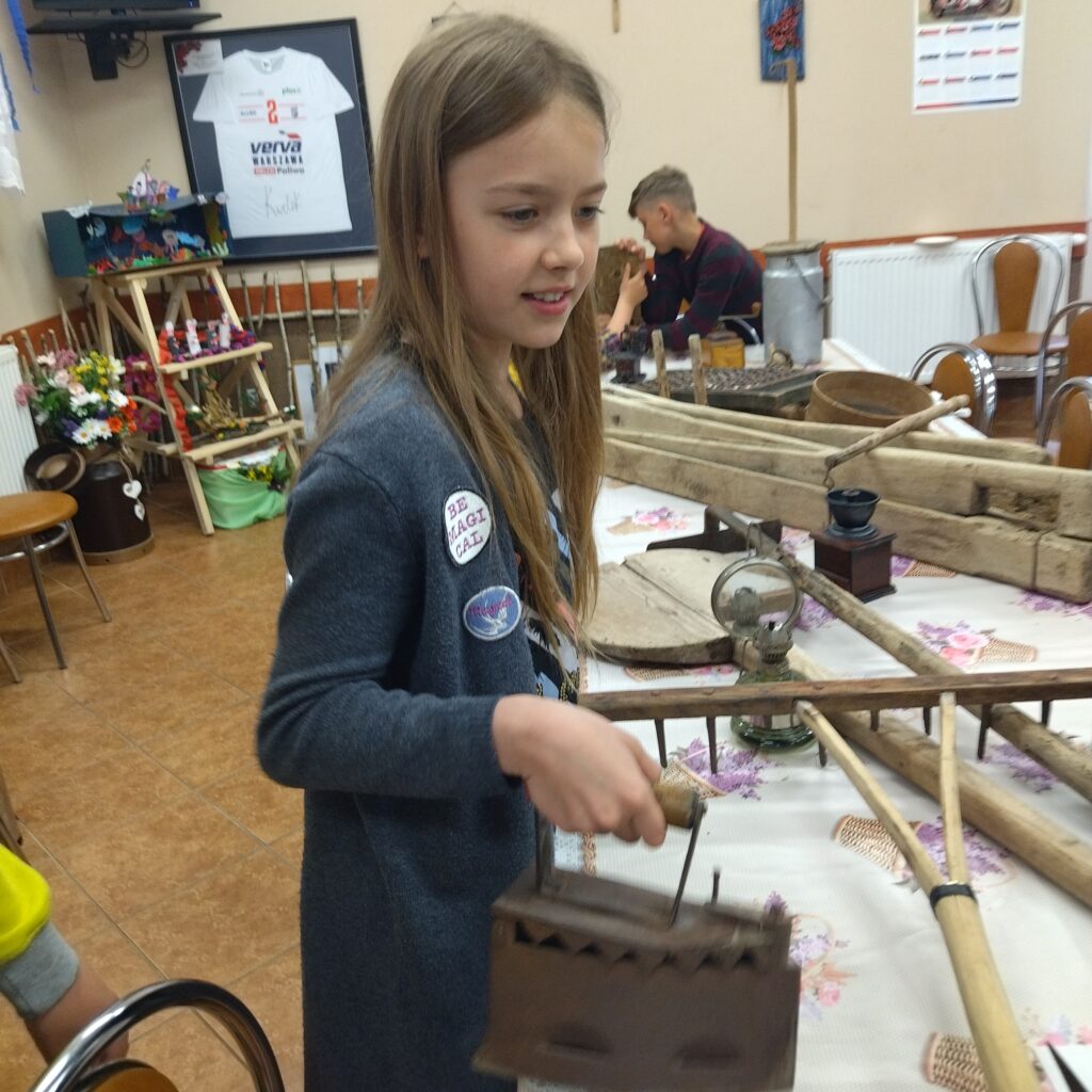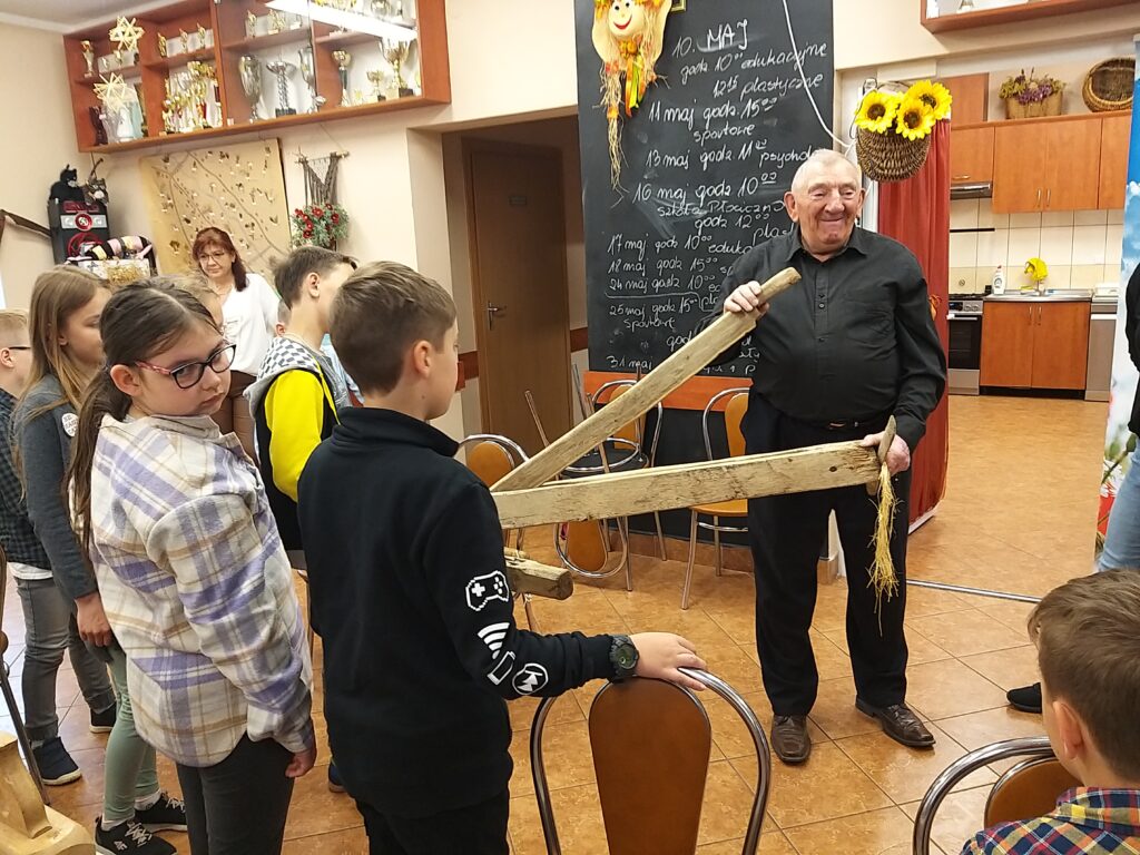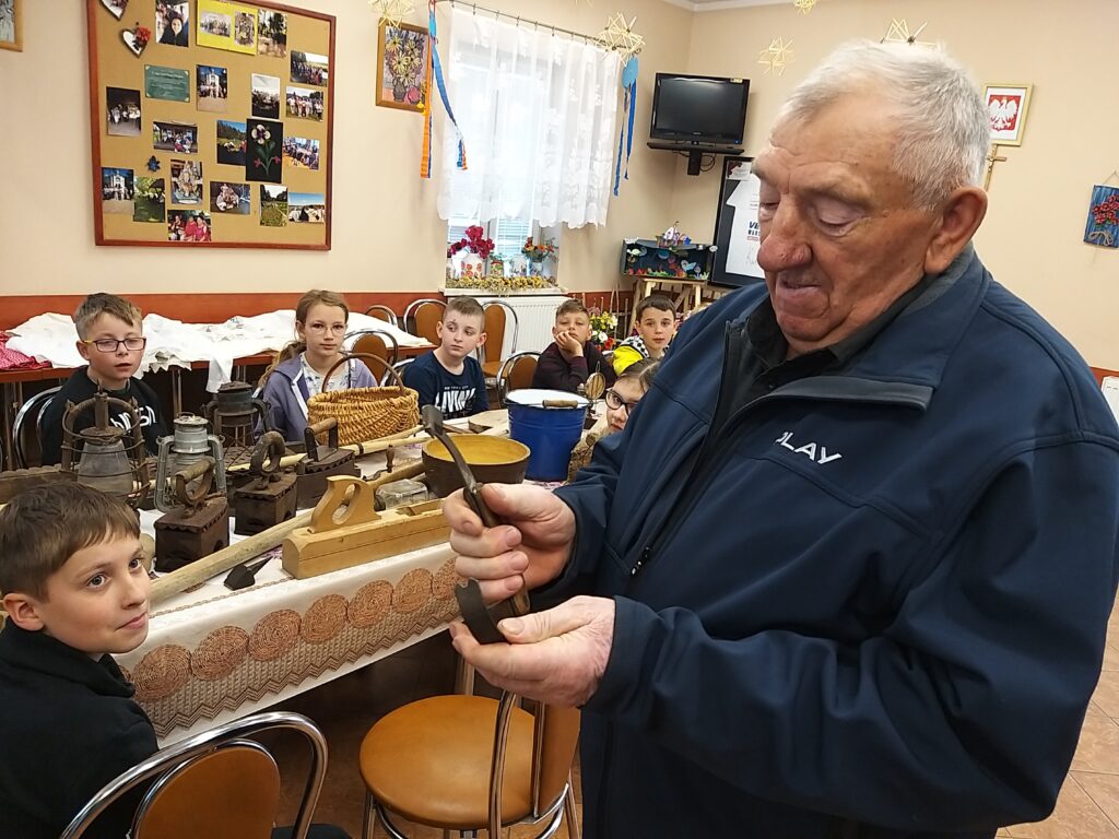 Cel podróży – wieś 100 lat temu. Informacji na temat życia dawnych mieszkańców udzieliła nam wspaniała Pani Sołtys Małgorzata Dojnikowska, cudowne panie z Koła Gospodyń Wiejskich w Sobolewie oraz Pan Wacław Białaszewski – mistrz barwnych opowieści. Dzięki rozmowom, obserwacji, a nawet pracy z wykorzystaniem zgromadzonych sprzętów, udało nam się przenieść w ,,dawne czasy”.