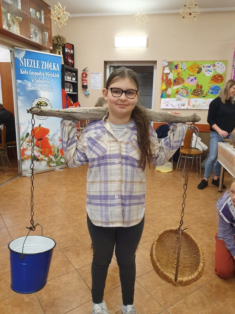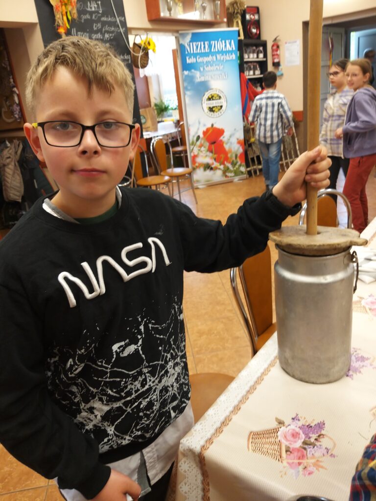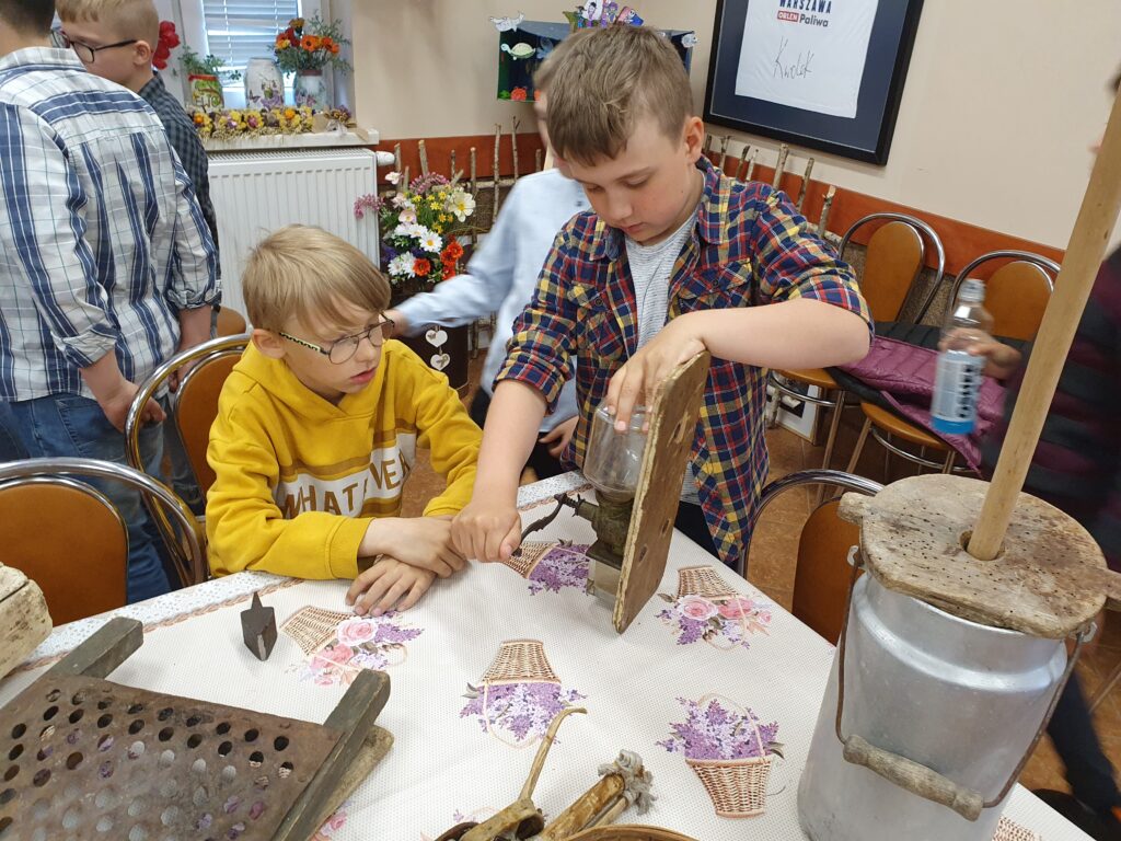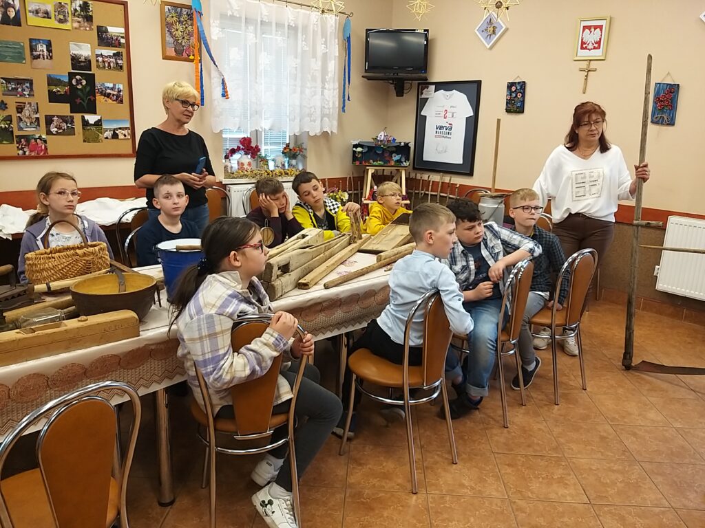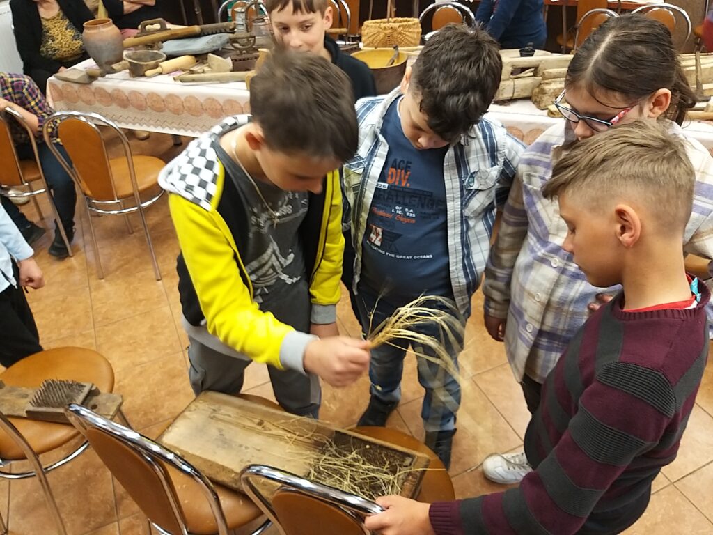 Cel podróży – wieś 100 lat temu. Informacji na temat życia dawnych mieszkańców udzieliła nam wspaniała Pani Sołtys Małgorzata Dojnikowska, cudowne panie z Koła Gospodyń Wiejskich w Sobolewie oraz Pan Wacław Białaszewski – mistrz barwnych opowieści. Dzięki rozmowom, obserwacji, a nawet pracy z wykorzystaniem zgromadzonych sprzętów, udało nam się przenieść w ,,dawne czasy”.