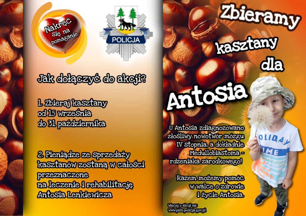 Tym razem chcemy pomóc Antosiowi z Pisza. ANTOŚ LENKIEWICZ to 5-letni chłopiec, który walczy ze złośliwym nowotworem mózgu IV stopnia, a dokładnie Medullobiastoma rdzenia zarodkowego. Leczenie onkologiczne trwa już ponad 1,5 roku. Niestety nastąpił nawrót choroby. Antoś to bystry, uśmiechnięty i waleczny chłopiec nazywany przez rodziców ,,Promyczkiem”. Pomóżmy mu w leczeniu i rehabilitacji zbierając dla niego kasztany.