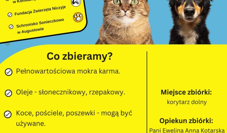 Samorząd Uczniowski wraz z Centrum Aktywności Społecznej Pryzmat Suwałki organizuje zbiórkę dla zwierząt potrzebujących pomocy.