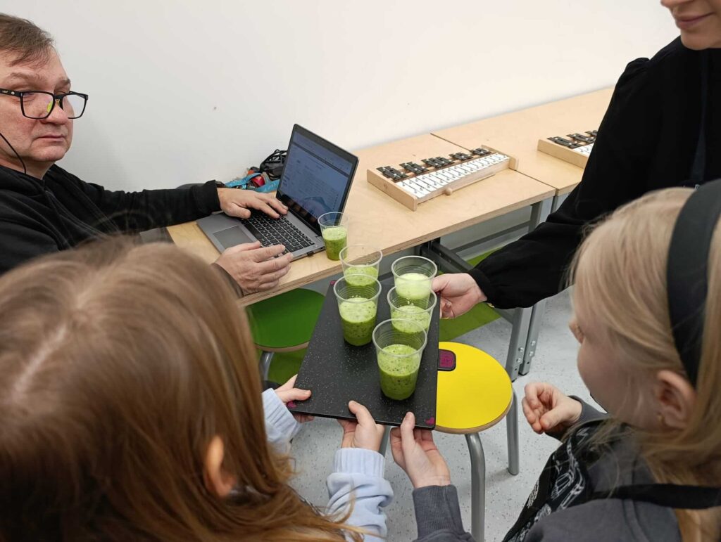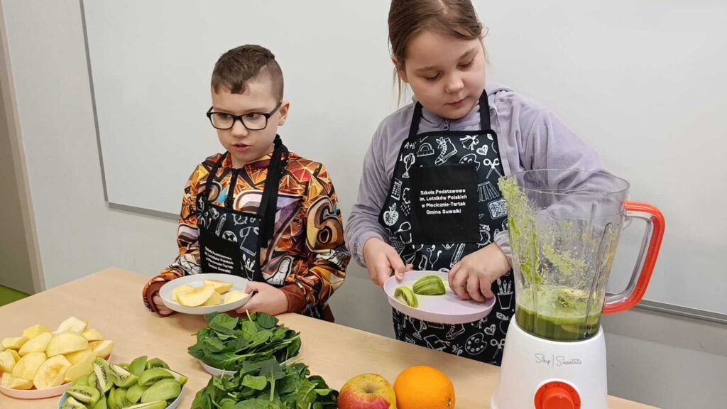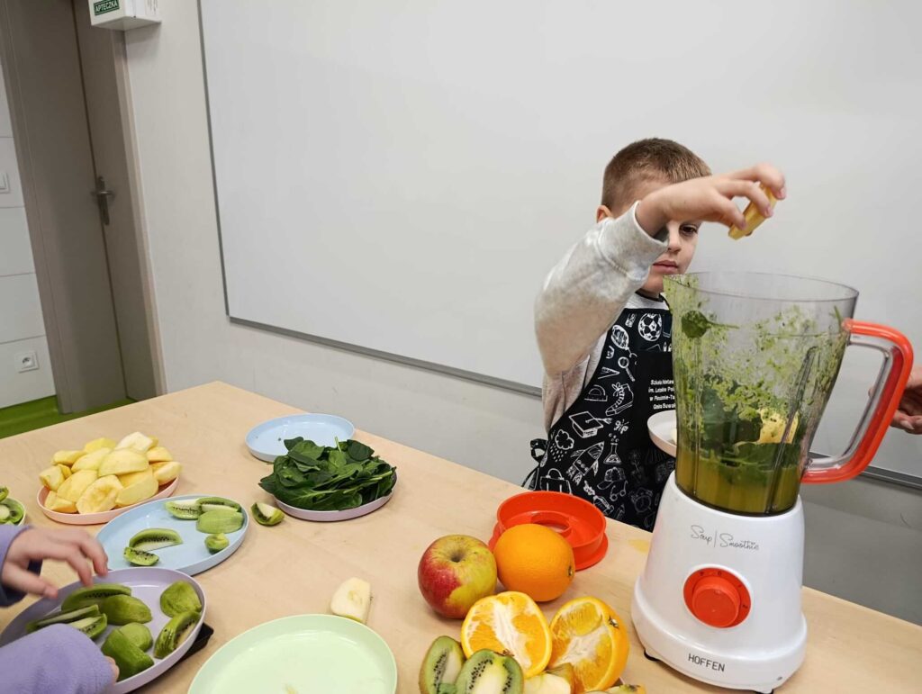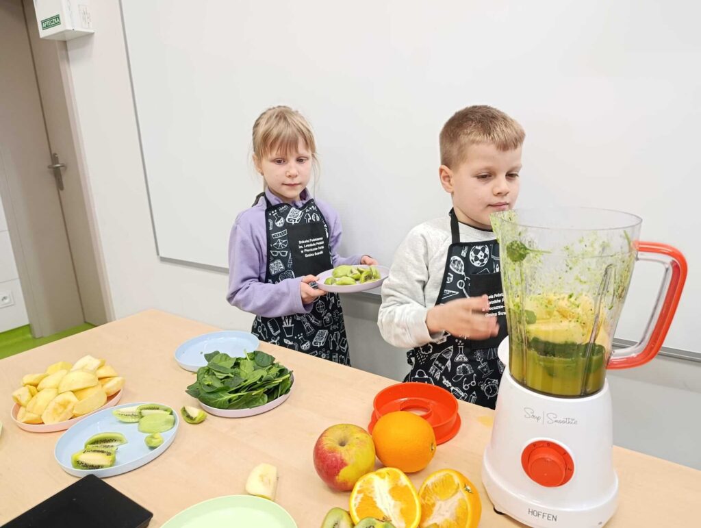 „Zjedz zdrowo – żyj kolorowo” w praktyce! W ramach innowacji pedagogicznej uczniowie klasy I wzięli udział w wyjątkowych warsztatach kulinarnych. Tym razem w szkolnej „mini kuchni” powstał pyszny, zielony koktajl ze szpinaku, kiwi, jabłka oraz soku z pomarańczy. Dzieci z ogromnym zaangażowaniem myły, obierały, kroiły i miksowały składniki, ucząc się przy tym zasad zdrowego odżywiania oraz higieny pracy. Była to doskonała okazja do rozwijania samodzielności, współpracy i odwagi w próbowaniu nowych smaków. Największą radość sprawiła oczywiście degustacja. Okazało się, że zdrowe może być naprawdę smaczne! To była prawdziwa lekcja poprzez działanie – pełna kolorów, uśmiechu i witamin!