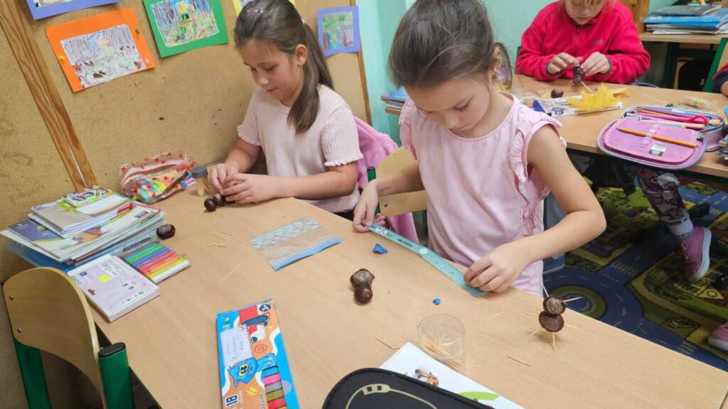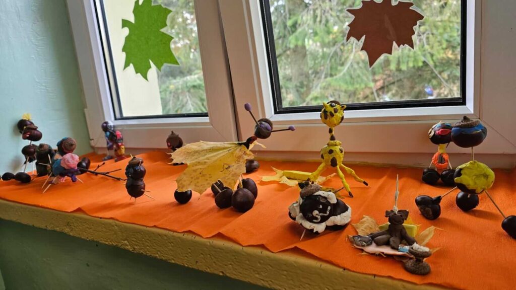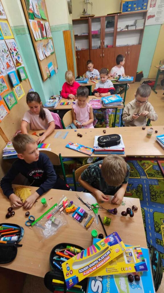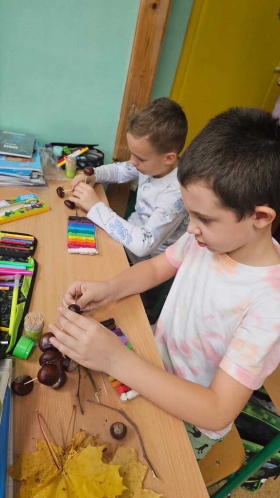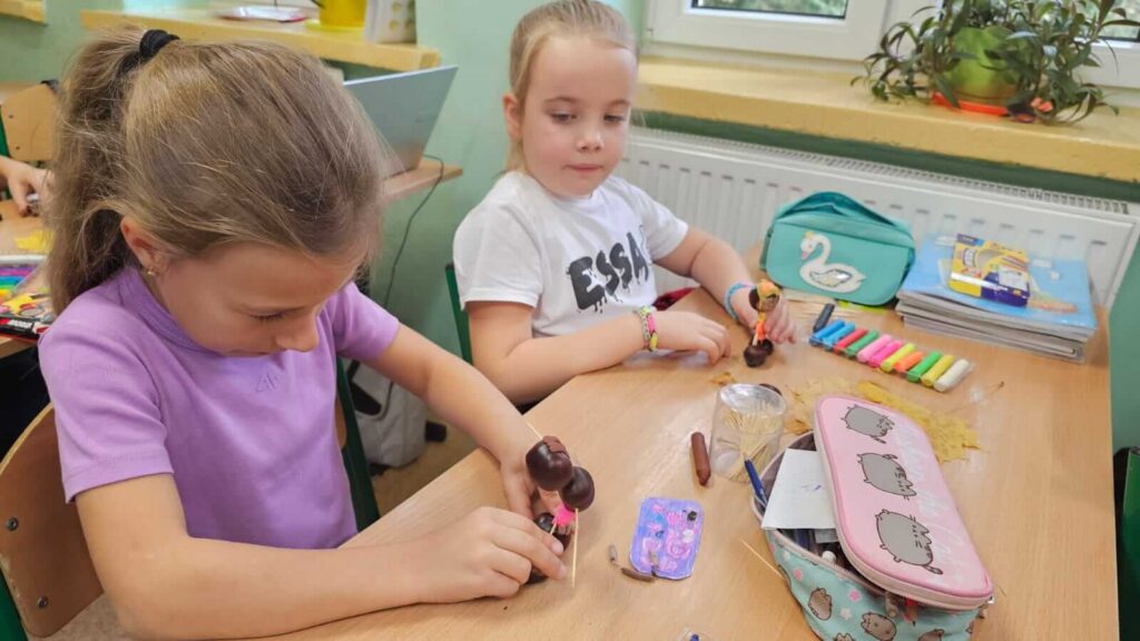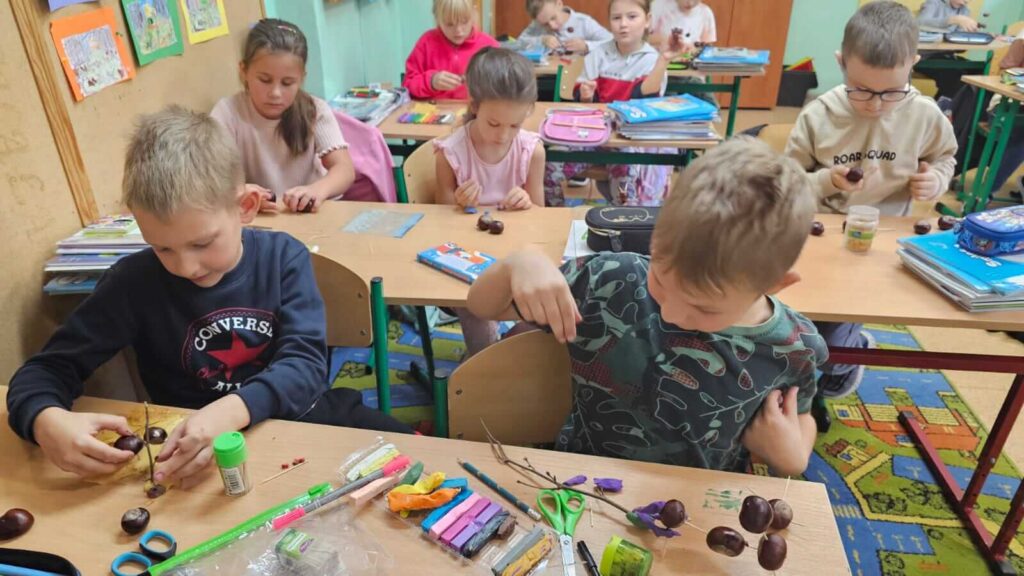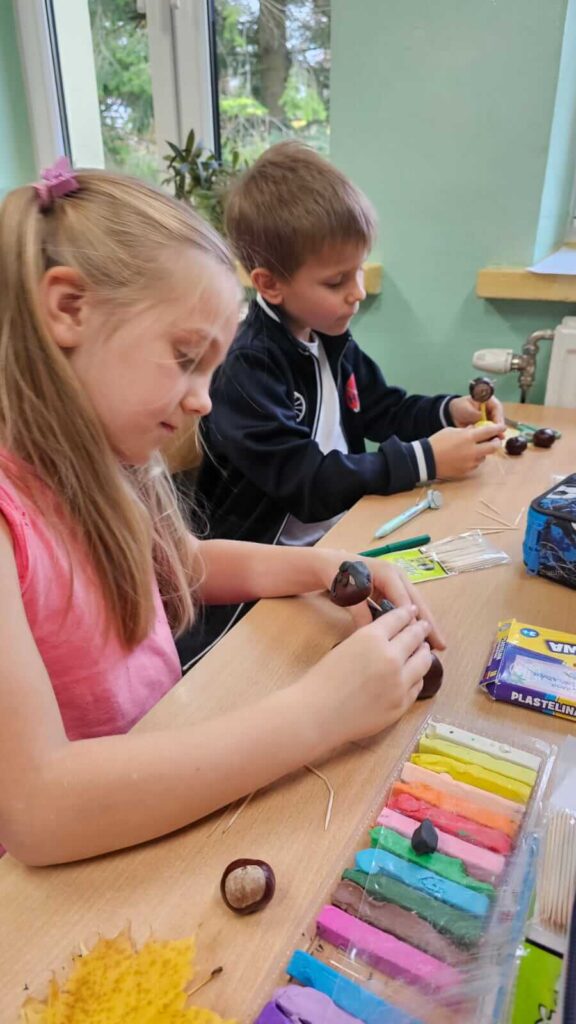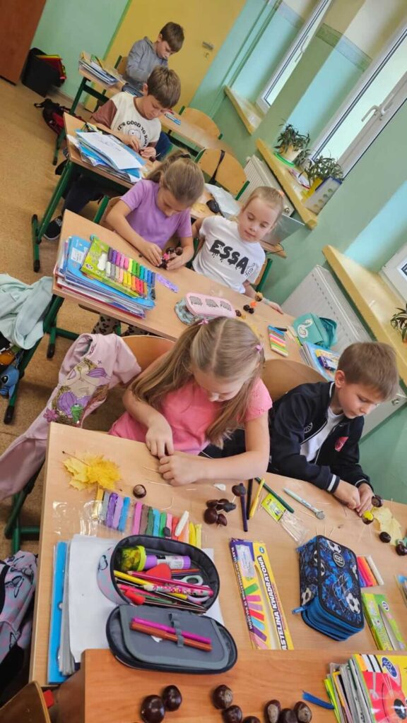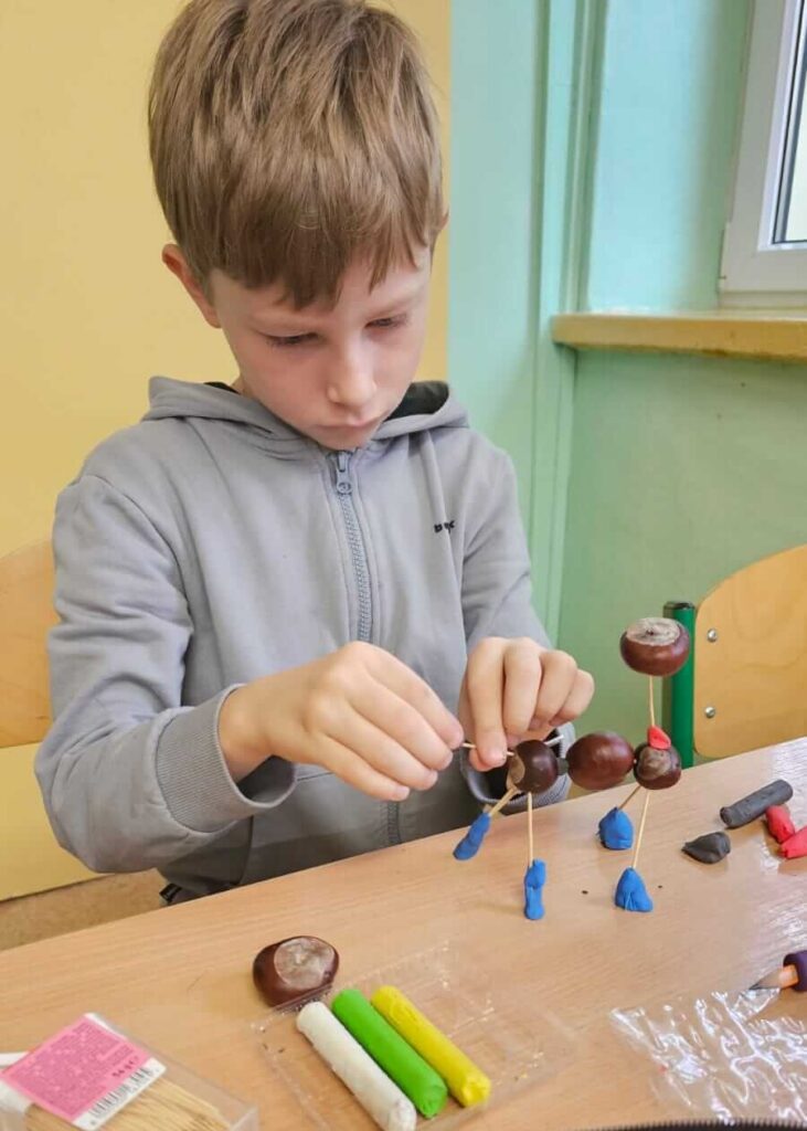 Jesienne spacery i zmiany zachodzące w przyrodzie sprzyjają zdobywaniu wiedzy przyrodniczej. To doskonały wstęp do rozwijania dziecięcej kreatywności. Uczniowie klasy I wykazali się niesamowitą pomysłowością. Wykorzystali zebrane wcześniej dary jesieni i stworzyli z nich wspaniałe, kasztanowe ludziki. Dary jesieni są idealne do wspólnych zabaw w klasie i na podwórku.